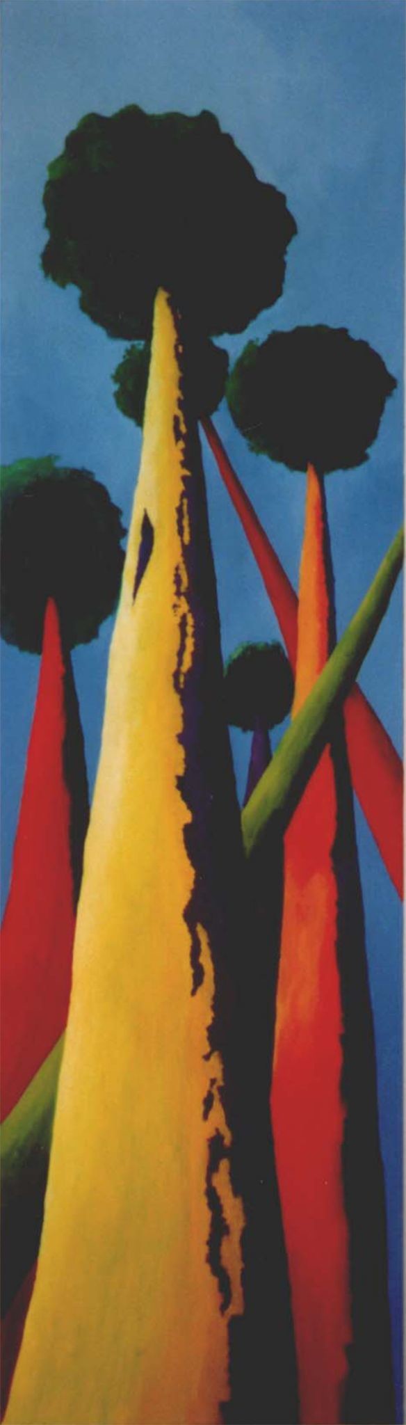 Langwerpig groot schilderij van de kruinen van bomen.