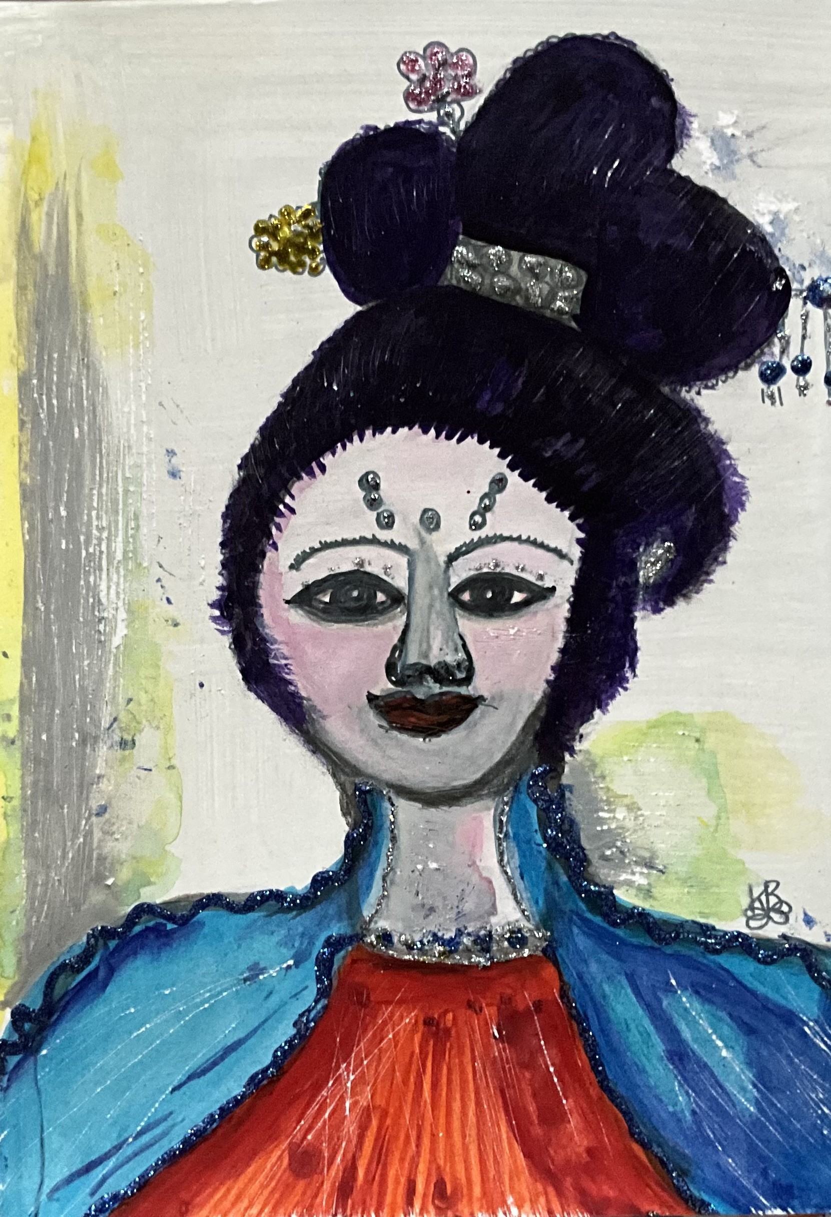 A beautiful lady on paper panting with mixed media, mixed technique and mixed vision.