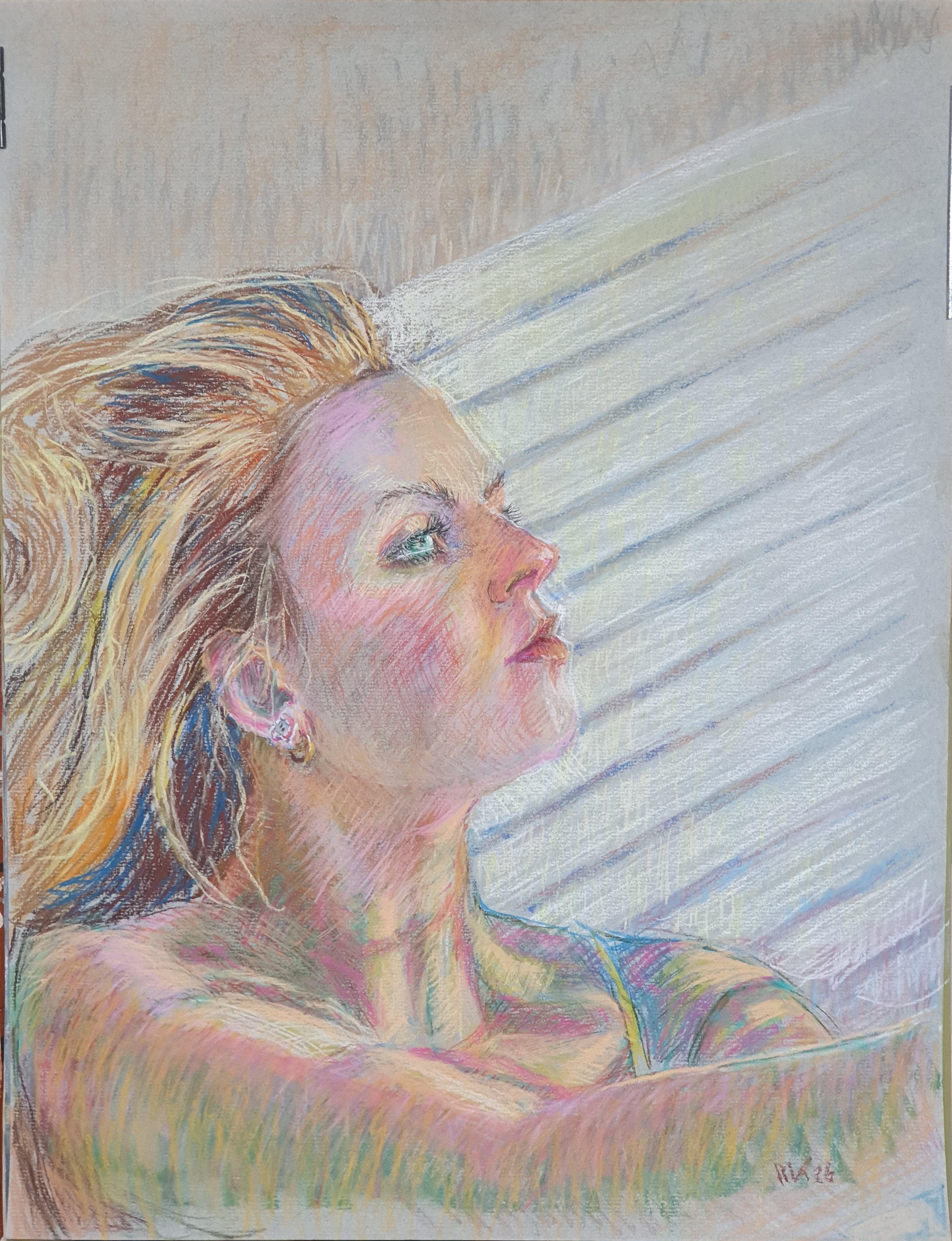 Vrouwportret in pastel. In strijklicht wat door jalousie valt.