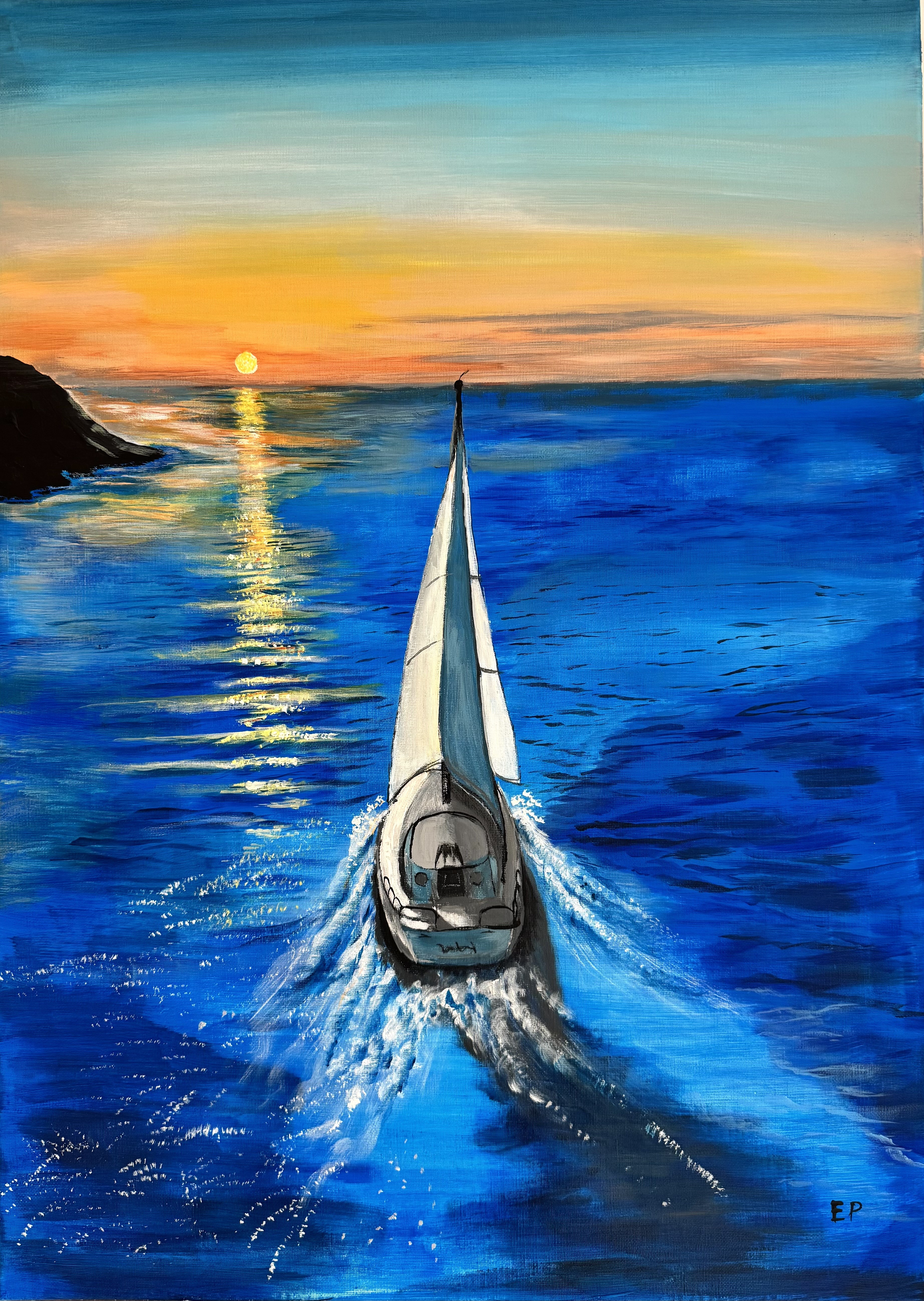 In dit werk beweegt het licht over het wateroppervlak, terwijl daaronder de diepte zichtbaar wordt. Subtiele overgangen in blauw en goud suggereren de zeebodem en geven het schilderij een gelaagd karakter. Het spel tussen licht en donker creëert ruimte en verstilling, waarbij de toeschouwer wordt uitgenodigd om verder te kijken dan alleen het oppervlak. Dit schilderij bevindt zich in Spanje. Geschilderd door Erik