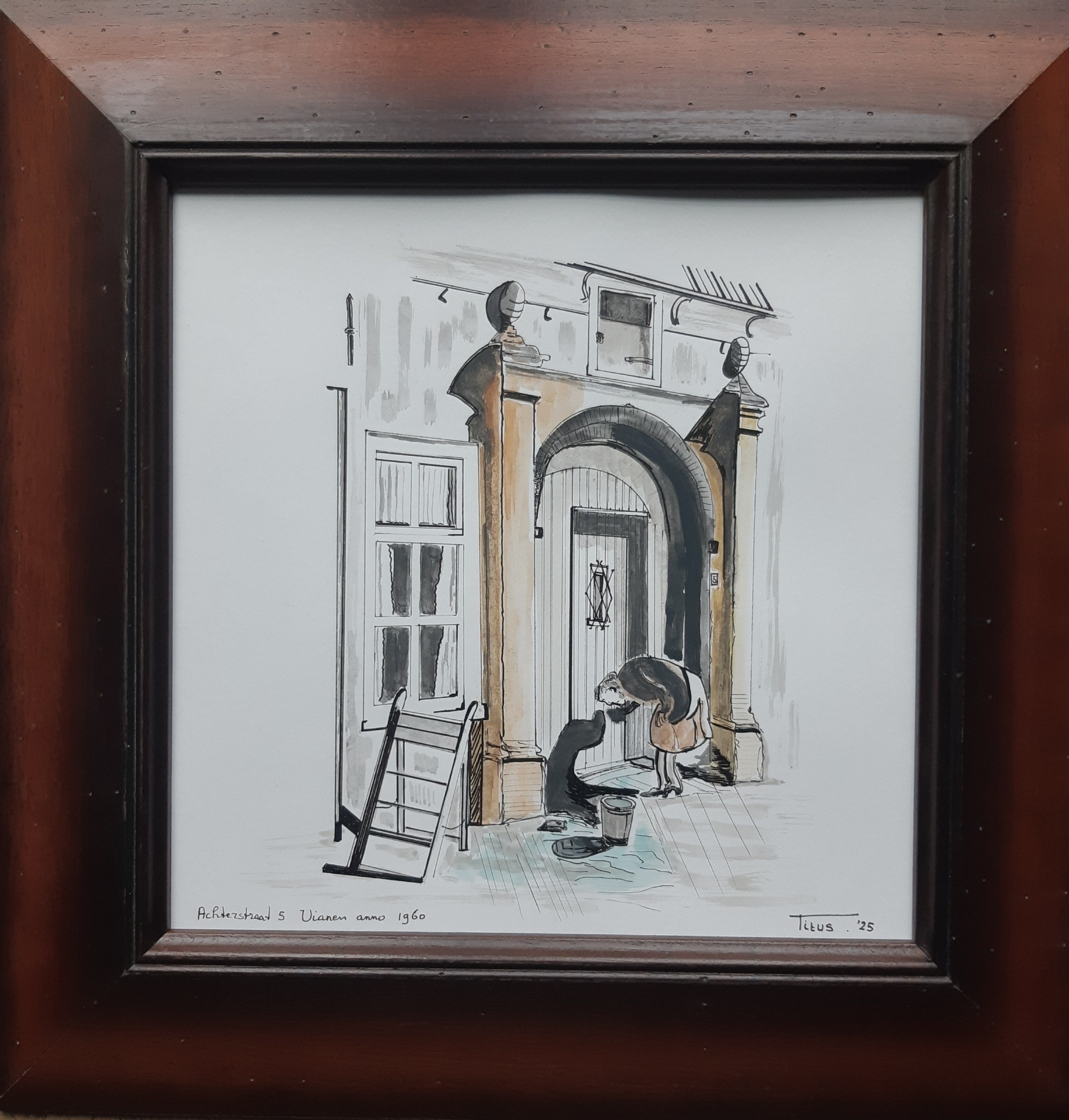 Deze ijverige bewoonster maakt de voordeur van haar huis (Achterstraat 5) schoon.