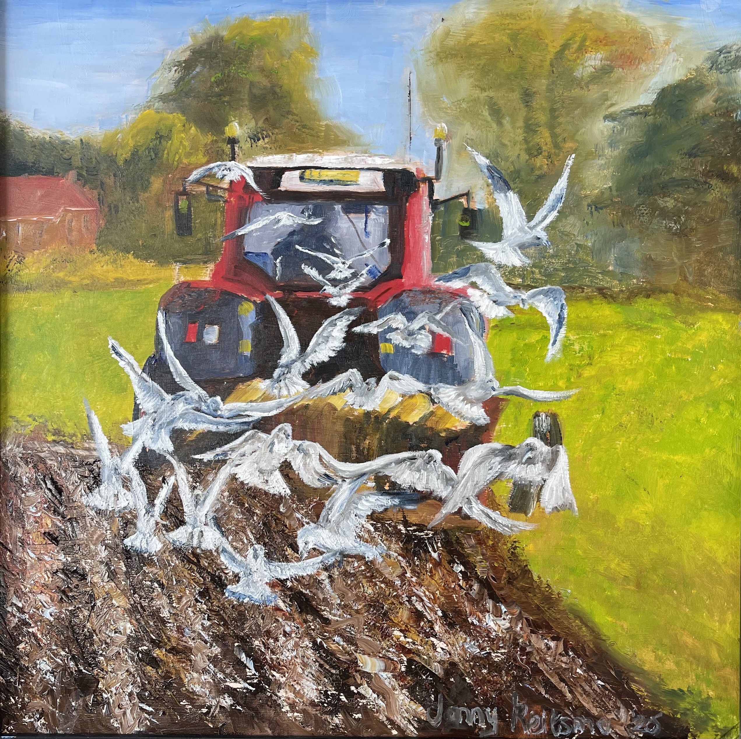 Tractor op akker met meeuwen