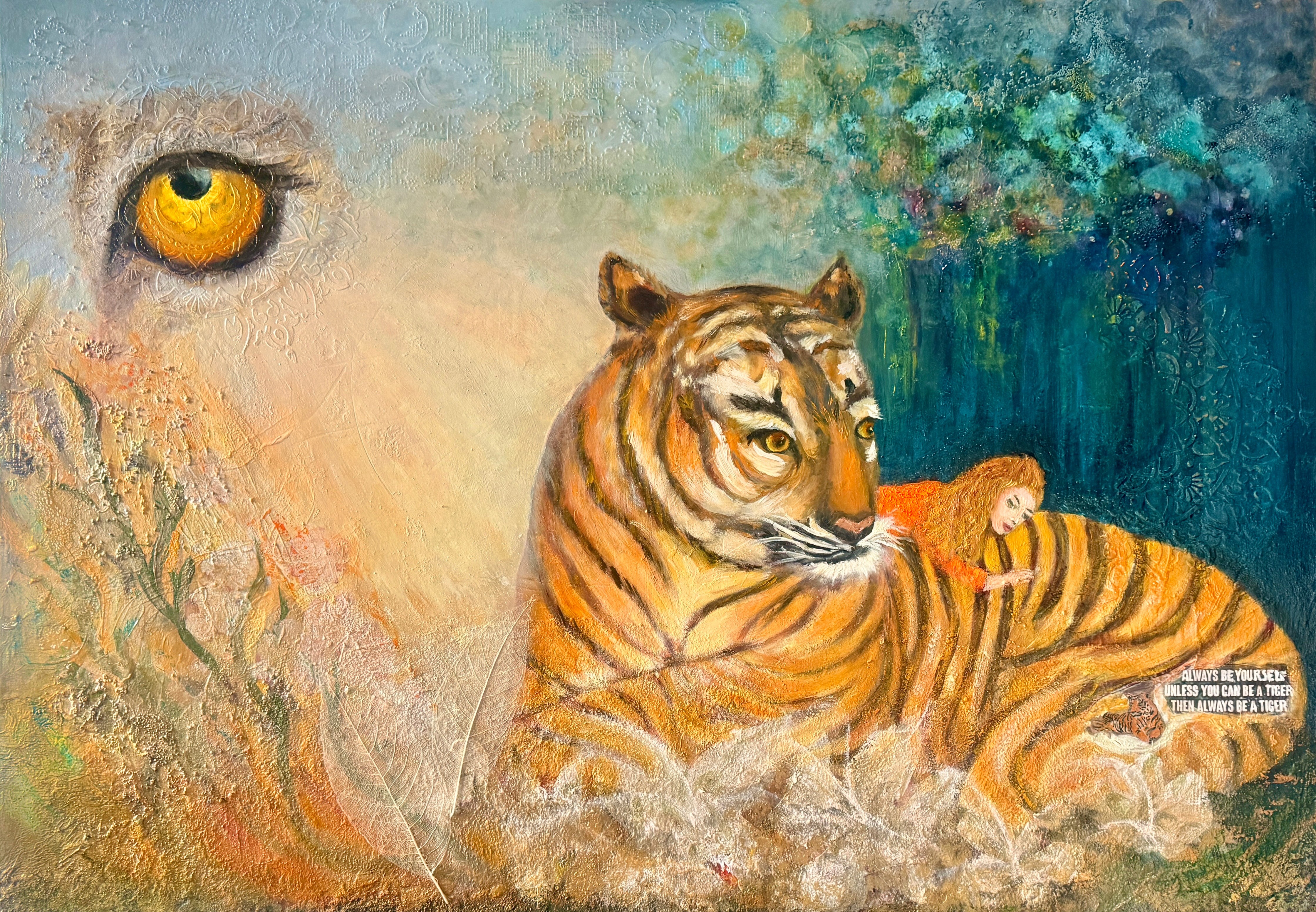 'Always be a tiger' - olieverf en structuren op een 70 x 100 doek. Gestart vanuit collages, waar een klein stukje van zichtbaar is gebleven, en daaruit ontstond het idee. Always be yourself. Unless you can be a tiger. Then always be a tiger. Dat is toch een beste boodschap!