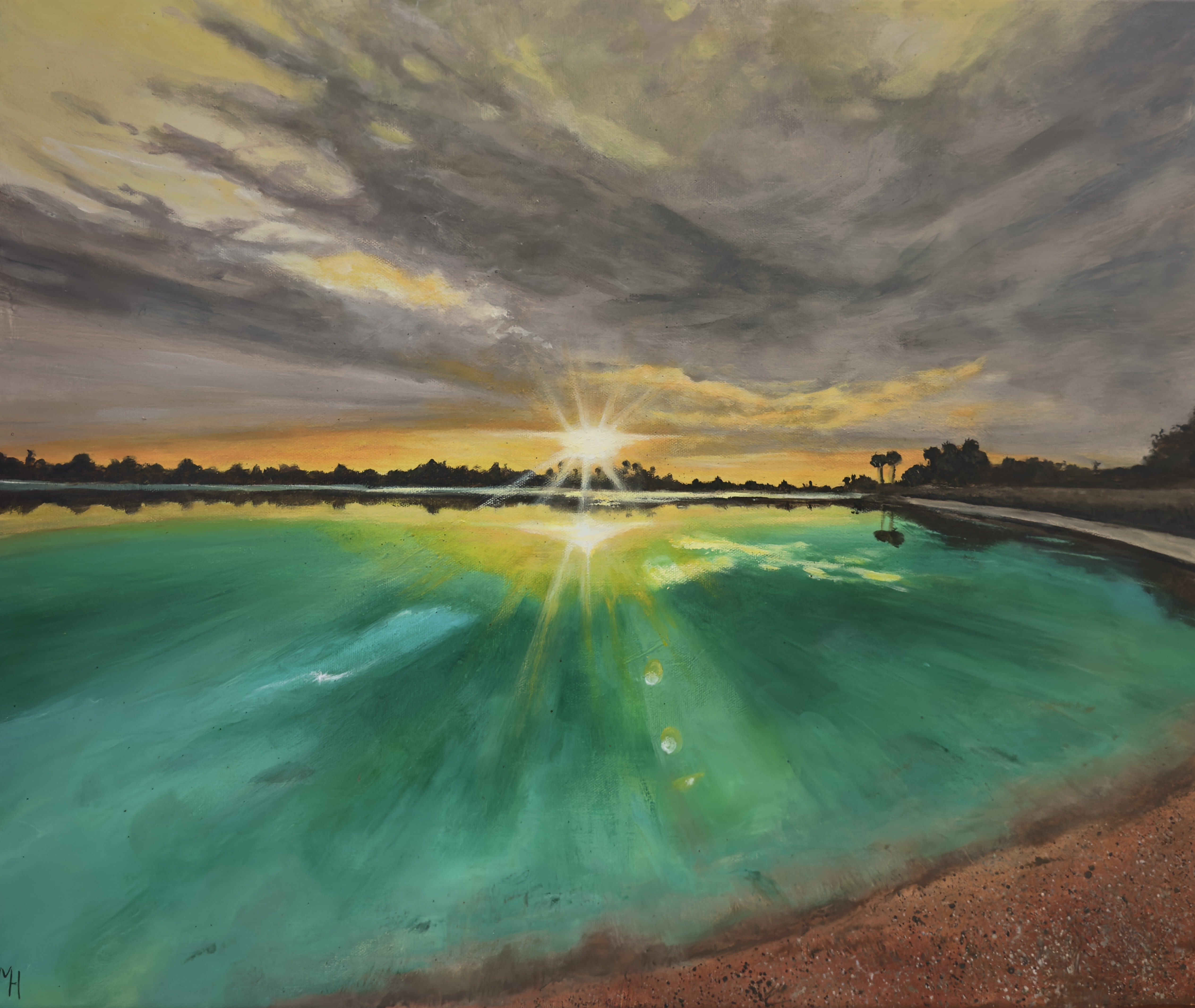 Aqua Aurora laat het moment zien waarop het eerste licht van de dag het water raakt. De warme gloed in de lucht en de turquoise tinten op het oppervlak zorgen voor een rustige, heldere sfeer. In dit werk draait alles om licht en hoe het de kleuren laat leven. Het schilderij brengt een gevoel van stilte en ruimte, alsof je even midden in de natuur staat vlak voordat de dag begint. Een sfeervol werk dat direct de aandacht trekt door zijn zachte kleuren en het spel van reflectie. Geschilderd door Marescha