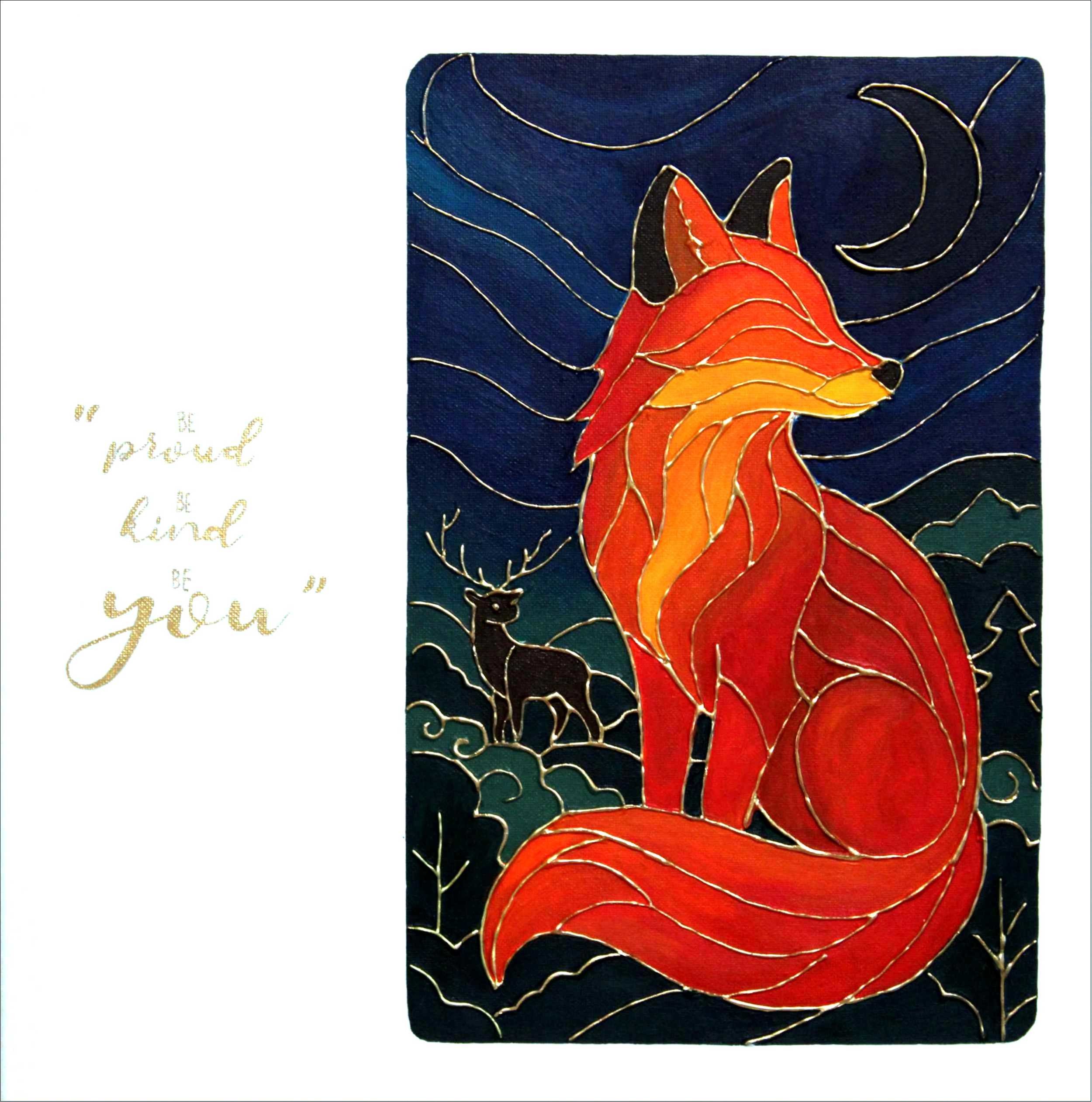 Dit schilderij toont een trotse, sierlijke vos onder een donkere nachtelijke hemel. De warme oranje- en roodtinten van de vos contrasteren met de donkere kleuren van de achtergrond. Ik heb reliëflijnen gebruikt die de vlakken omkaderen en deze heb ik goudkleurig gemaakt, om het geheel een wat luxere uitstraling te willen geven. De tekst ‘Be proud, be kind, be you’ vormt samen met de vos een inspirerend geheel: een herinnering om jezelf te omarmen met trots en vriendelijkheid.