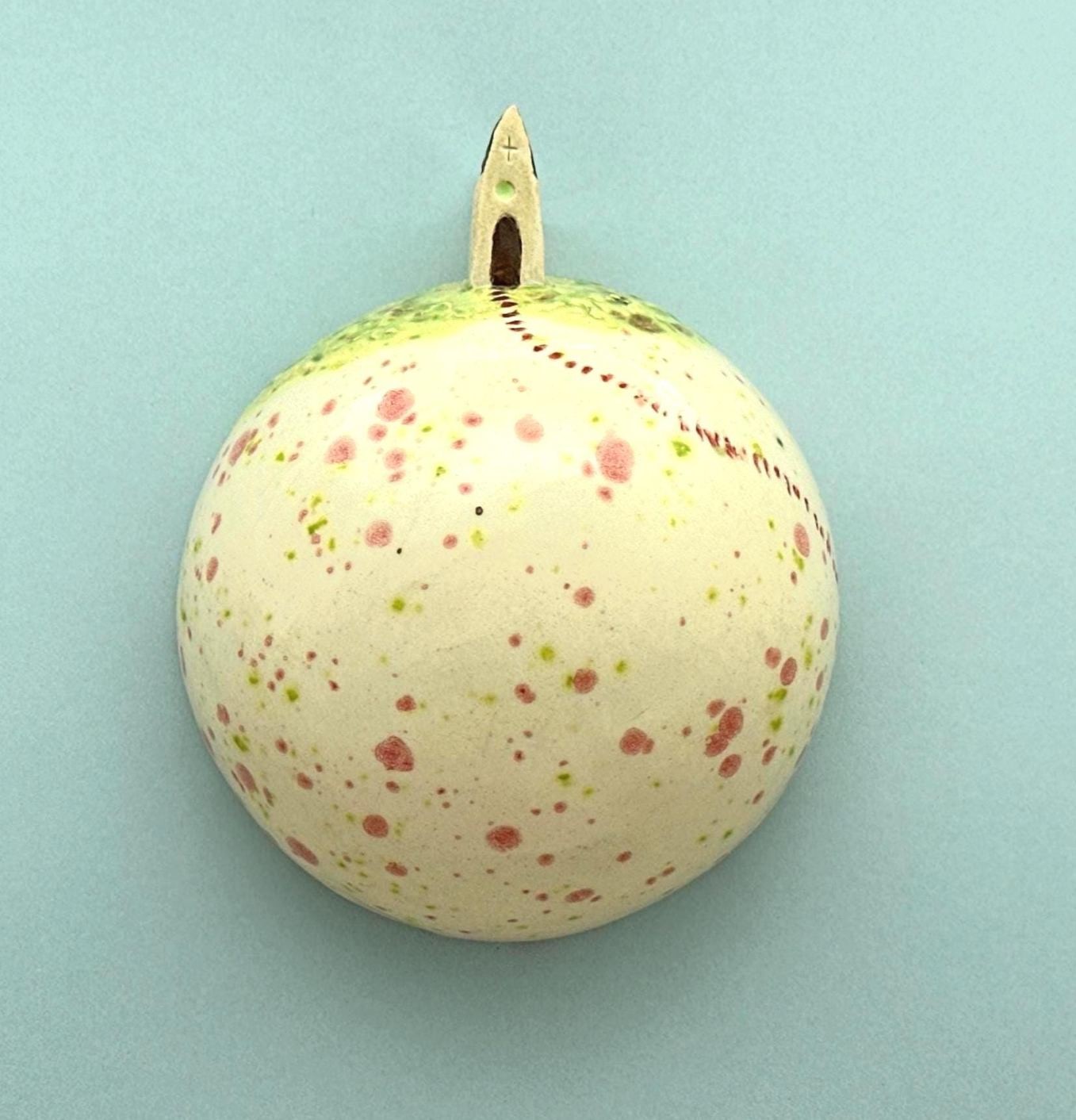 Op deze handgemaakte wandbol slingert een fijn rood pad door het landschap omhoog, richting een klein kapelletje op een begroeide heuveltop. De bol is geglazuurd in een zachte crèmeachtige tint met levendige spikkels in pastelgeel, roze en groen. De kapel is als silhouet bescheiden maar onmiskenbaar aanwezig — een verwijzing naar bezinning, verstilling en misschien een pelgrimstocht.