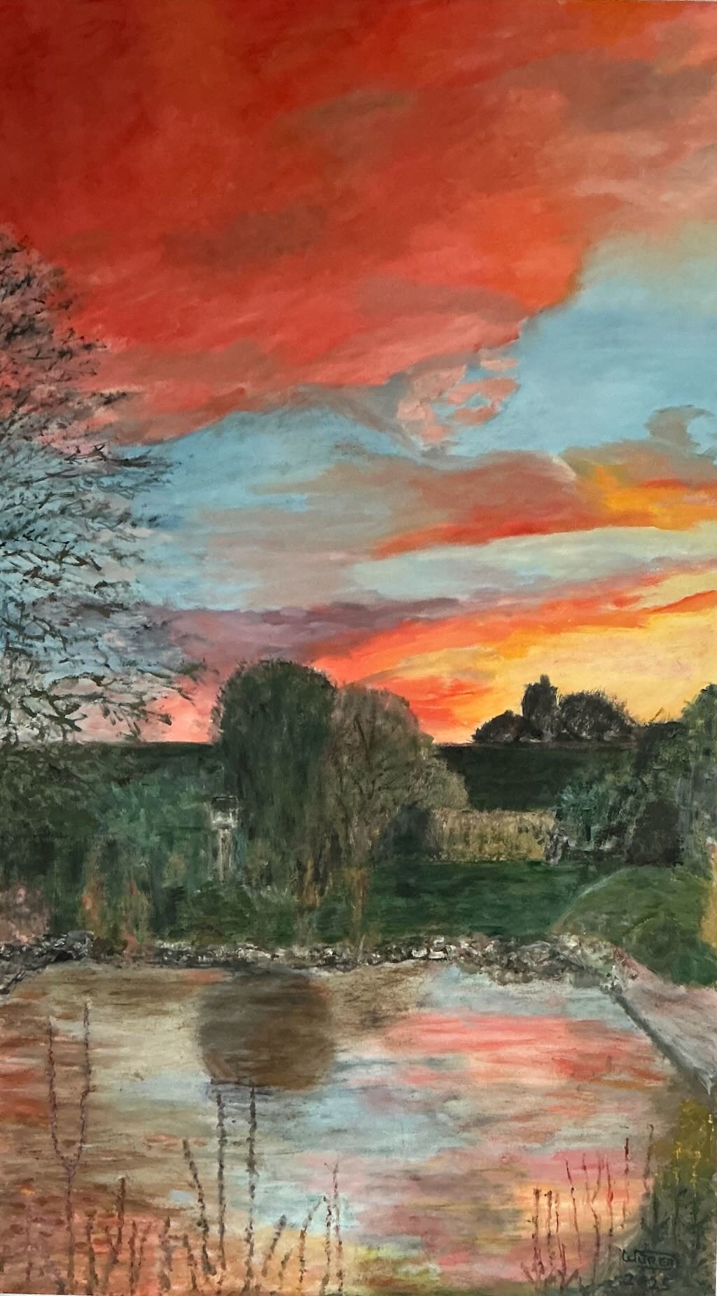 Het kader van het schilderij bepaalt wat je direct ziet: lucht, water en een klein deel begroeiing. Maar de boom die deels buiten beeld staat, trekt je blik naar de zijkant. Zo wordt duidelijk dat wat je ziet niet de volledige werkelijkheid weergeeft. Tegelijk vormen heg, gras en border een natuurlijke omlijsting binnen het beeld, waardoor er ook een intern kader ontstaat.