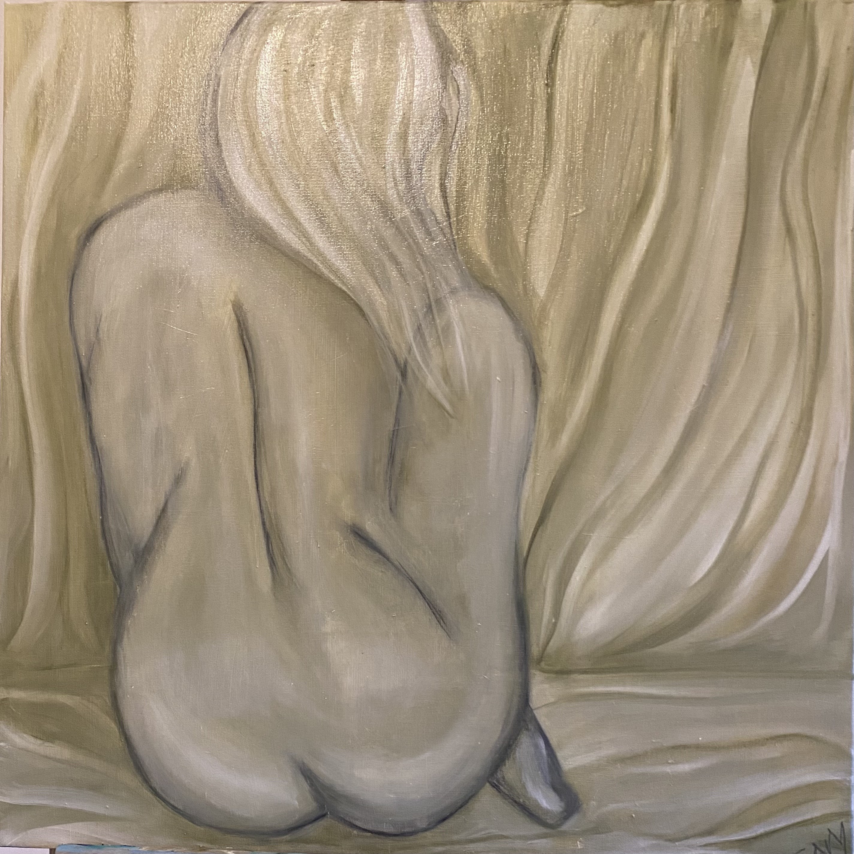 Deze painting staat voor een vrouw die zichzelf verschuilt uit onzekerheid over haar lichaam
