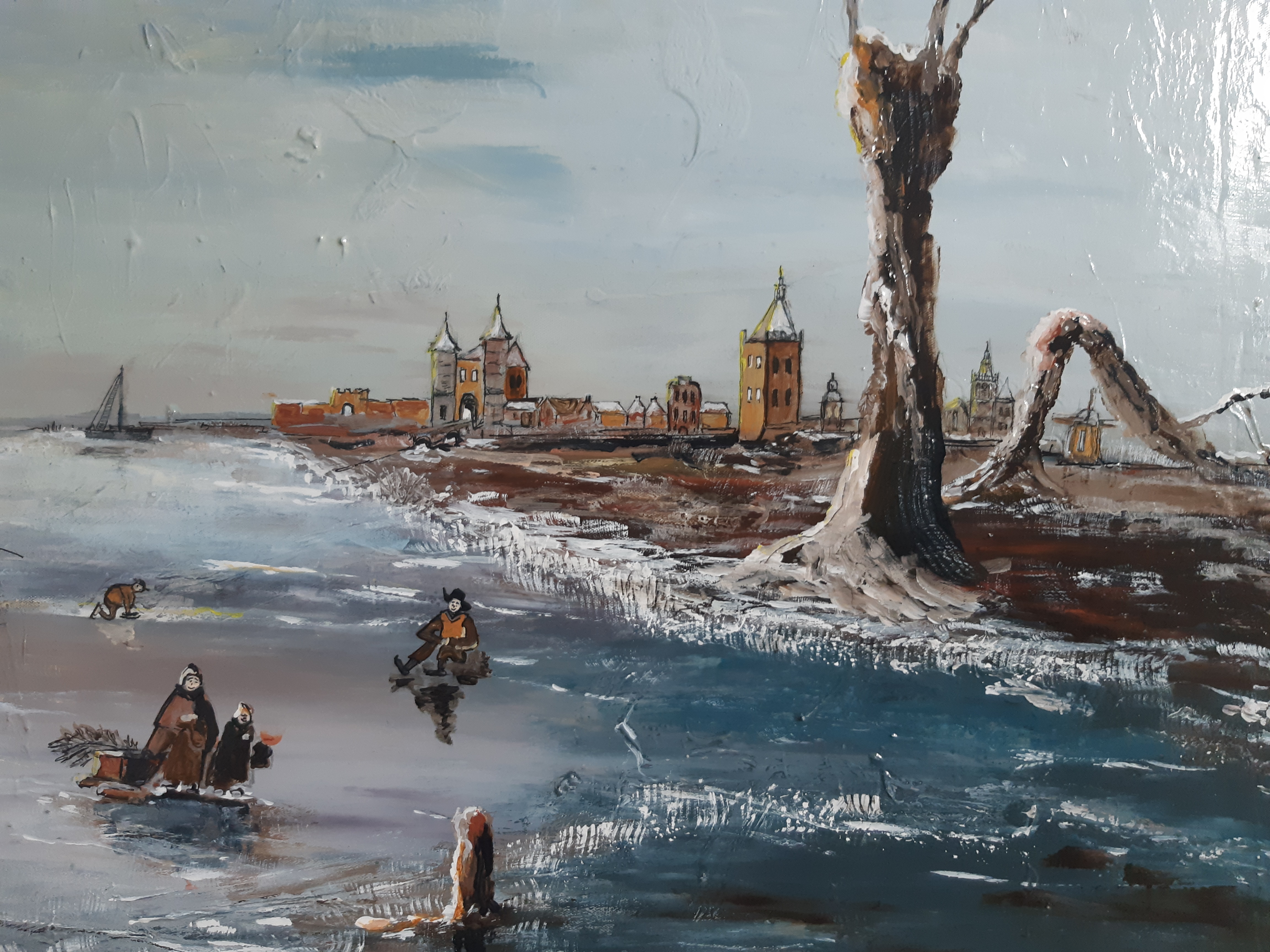 Koude winters van de 14de eeuw t/m 18de eeuw in Vianen aan de bevroren rivier de Lek. Detail van schilderij met zicht op Oostpoort, Lekpoort, Voortorens Lekpoort, Stadhuis, Kasteel Batenstein, Grote Kerk en Landpoort. U staat aan de westzijde van de stad Vianen en U kijkt van west naar oost. Bij expo aanwezig vanaf 13 december 2025 tijdens Kerstmarkt te Vianen.
