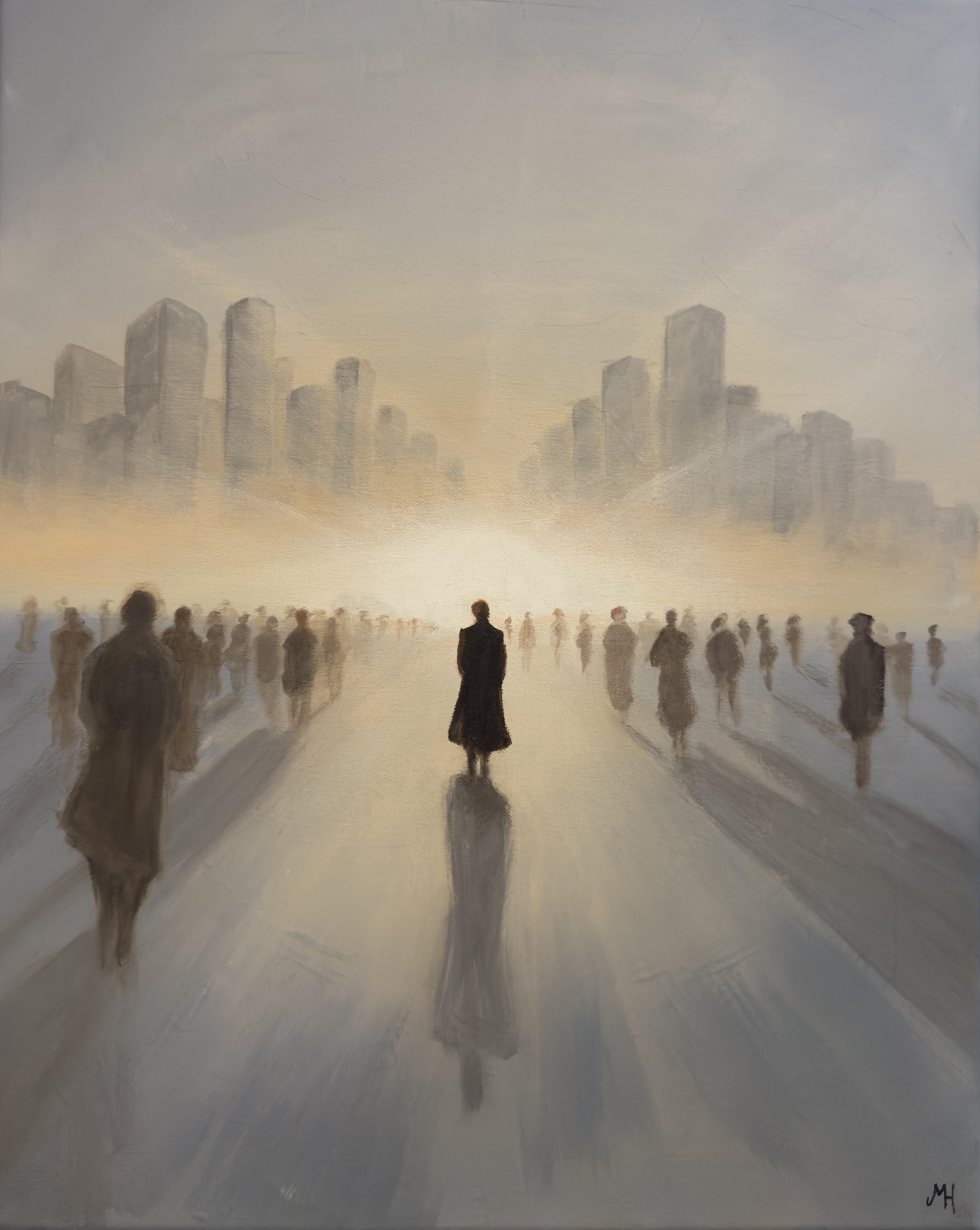 In Beyond the Horizon staat perspectief en richting centraal. Door te werken met een duidelijk verdwijnpunt en een groep figuren ontstaat diepte en spanning in de compositie. De figuren bewegen zich naar voren, maar hun bestemming blijft open. Het schilderij nodigt uit tot interpretatie. De kijker bepaalt zelf waar de weg naartoe leidt en wat er zich achter de horizon bevindt. Geschilderd door Marescha Holtkamp