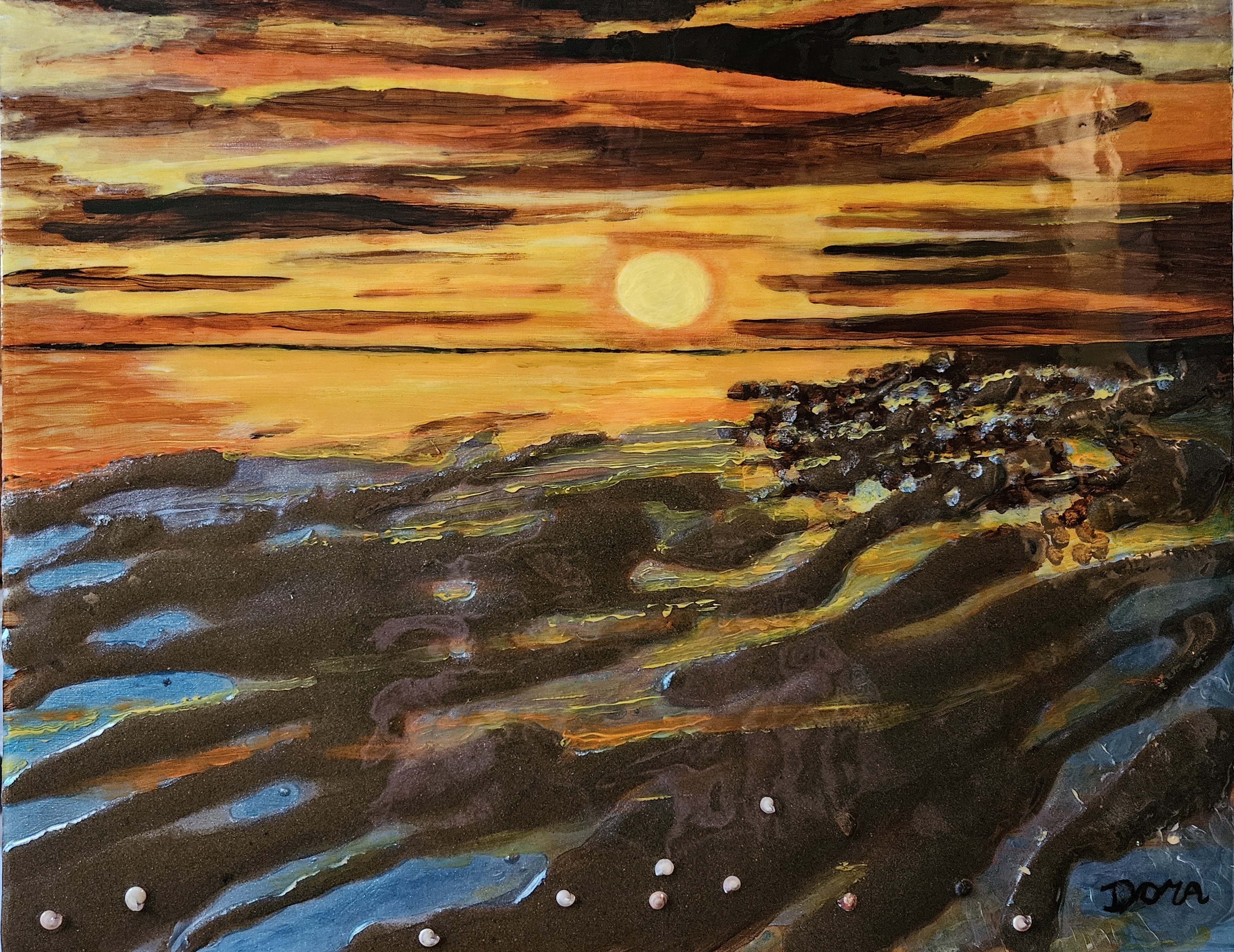 Epoxy schilderij met natuurlijke materialen geschilderd met acrylverf.