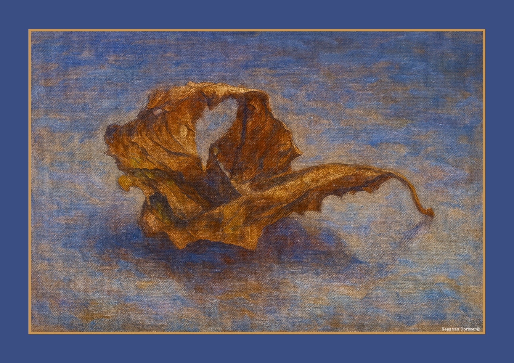 Dit werk heeft nu een digitale diepte gekregen, waarin het blad lijkt te zweven tussen herfst en winter. Het verschrompelde blad is niet zomaar dor, maar draagt sporen van warmte-oker, roestbruin, een vleugje groen. Het ijs waarop het rust, straalt niet alleen kilte uit, maar een bijna spookachtige gloed van blauw en paars. Penseelstreken maken het geheel etherisch, als een moment "tussen tijd en tijd", gevangen in verf.