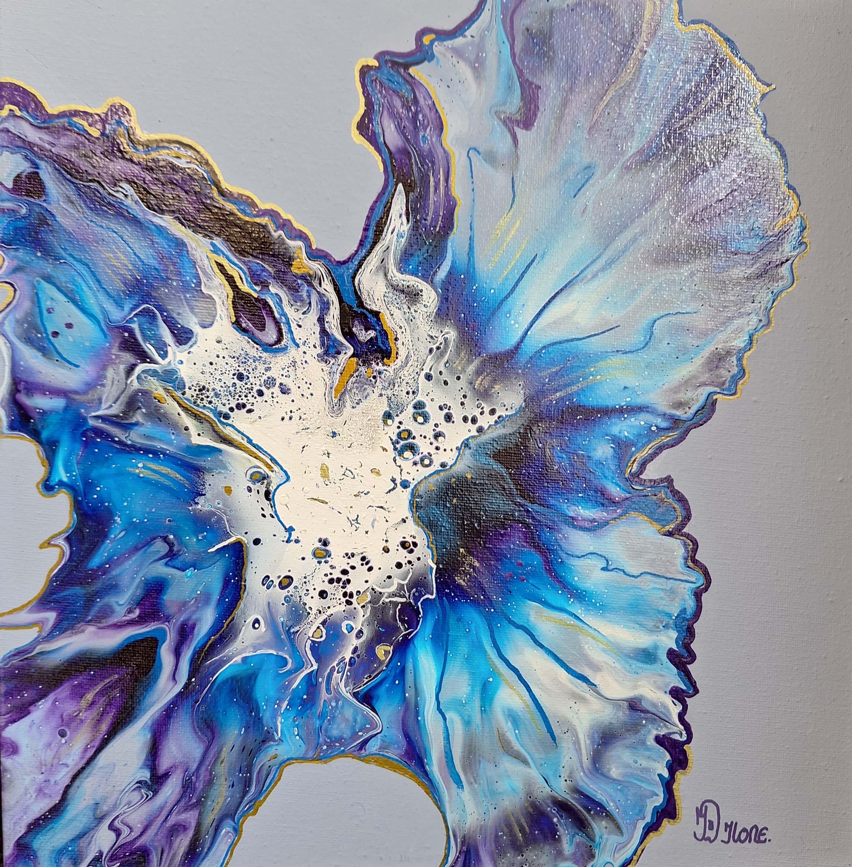 Acrylgiet techniek."In dit werk vloeien kleur en gevoel samen tot een krachtige, bijna bloemachtige vorm. De combinatie van diep blauw, paars en licht wit symboliseert beweging, groei en innerlijke rust. De gouden accenten geven het geheel een subtiele warmte