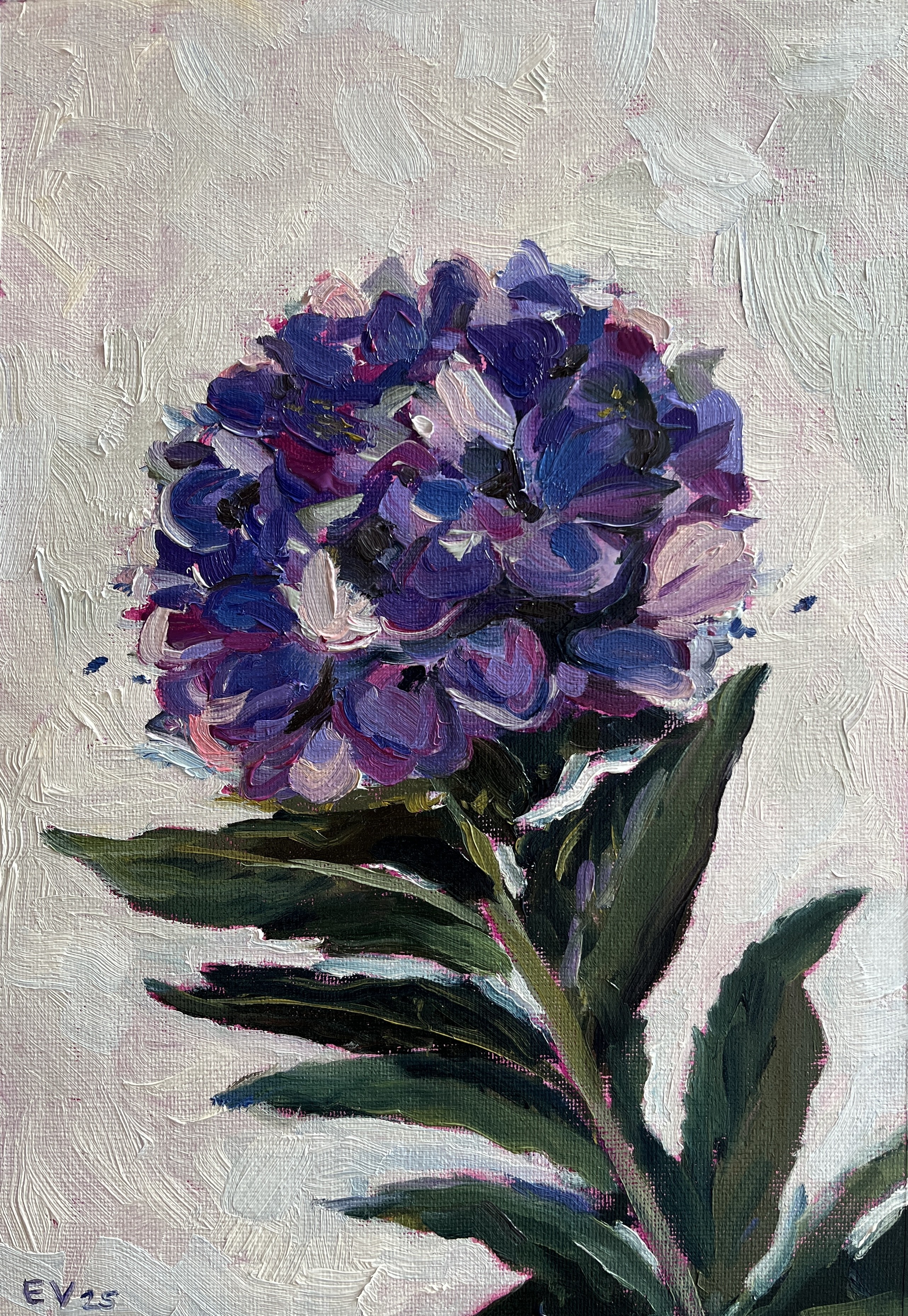 Olieverf op canvasdoek (ongespannen). Geëxperimenteerd met kleurtonen en textuur. Een ingetogen werk (voor mijn doen) waarbij de prachtige blauwe hortensia goed tot zijn recht komt.