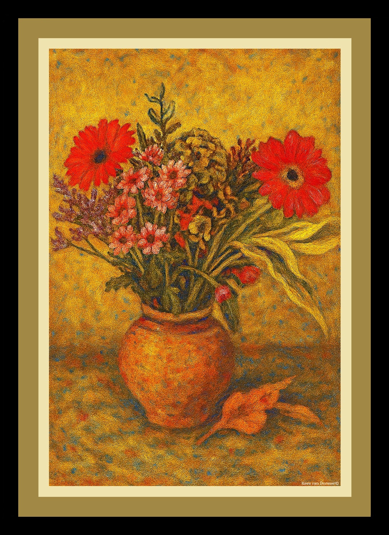 Dit zijn geen bloemen-dit zijn kleuren die lucht omarmen, licht verzamelen en leven zingen. De vaas is geen vaas, maar een moment van vlammen en verzachting. Wat bloeit, blijft niet-maar kleurt alles wat achterblijft.
