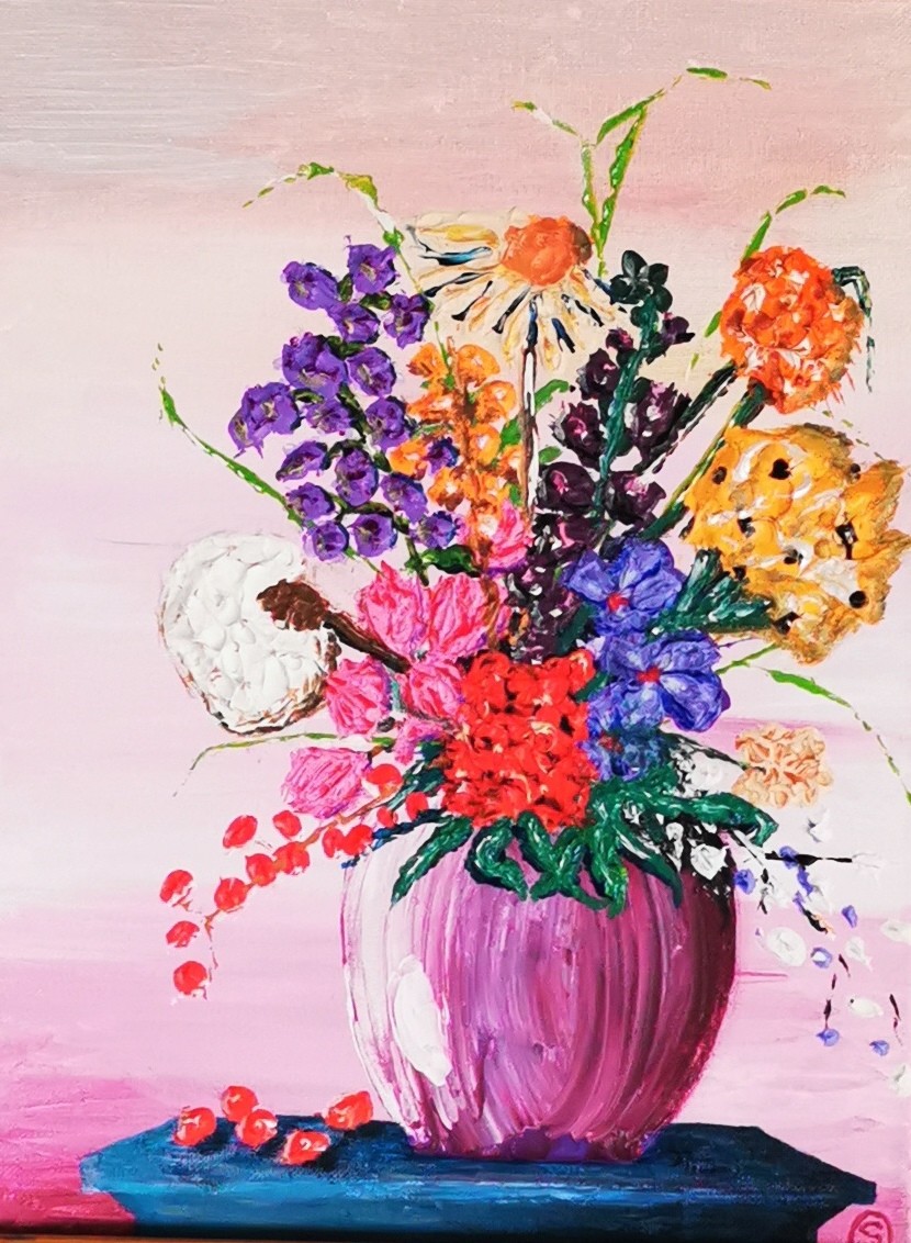 Bloemen op tafel is een reliefschilderij waarbij je de vormen mag voelen. Aanraken mag dus, dit draagt bij aan een betere beleving van het kleurrijke schilderij.