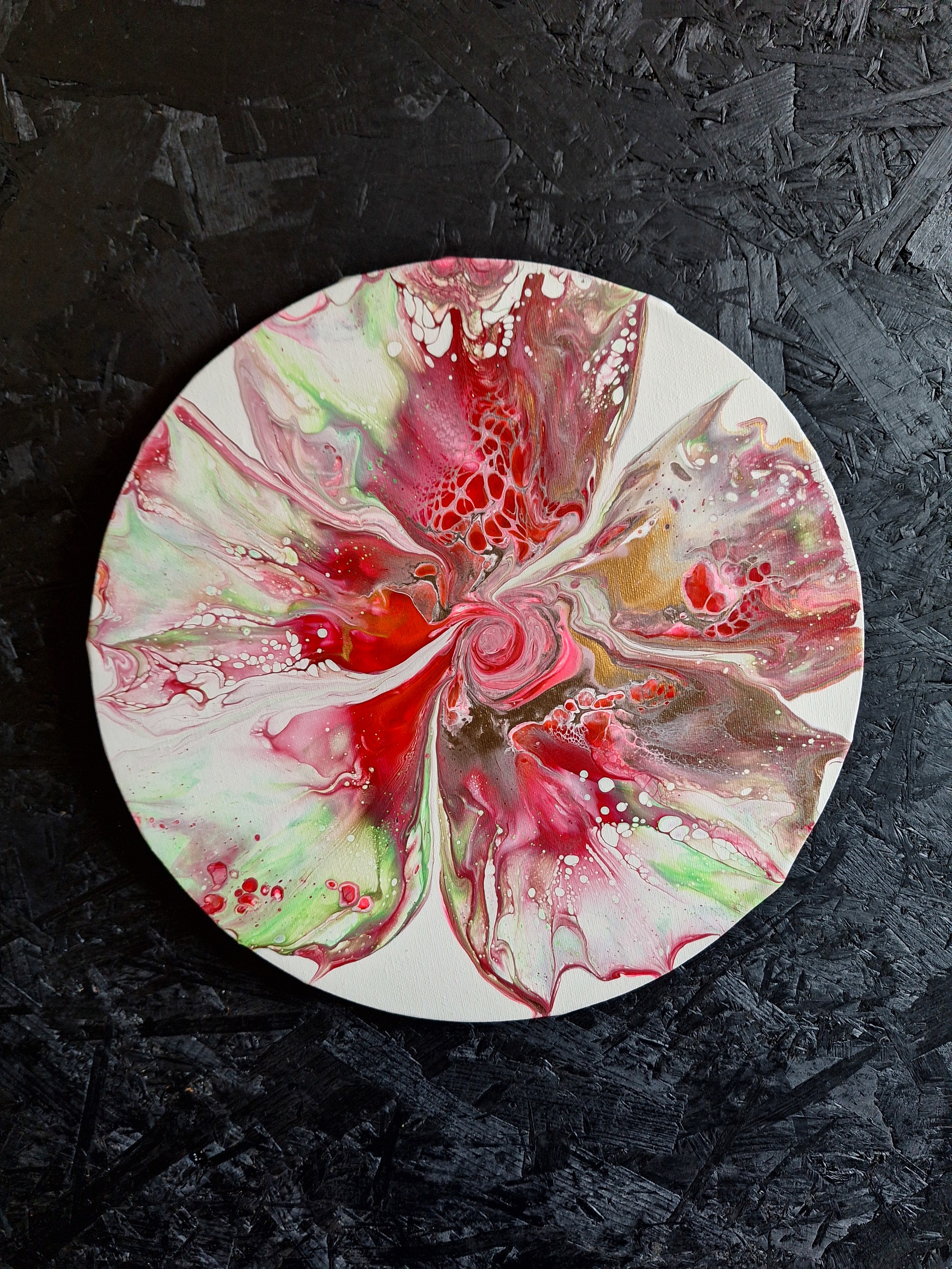 Acrylgiet techniek. Een explosie van kleur en energie gevangen in een cirkel van beweging. Blooming Pulse voelt als een bloem die niet alleen groeit, maar ademt en leeft. Vanuit een krachtige kern ontvouwt zich een spel van rood, zacht groen en wit, alsof de natuur zelf in beweging is. Dit werk nodigt uit om te blijven kijken—elke laag onthult iets nieuws.