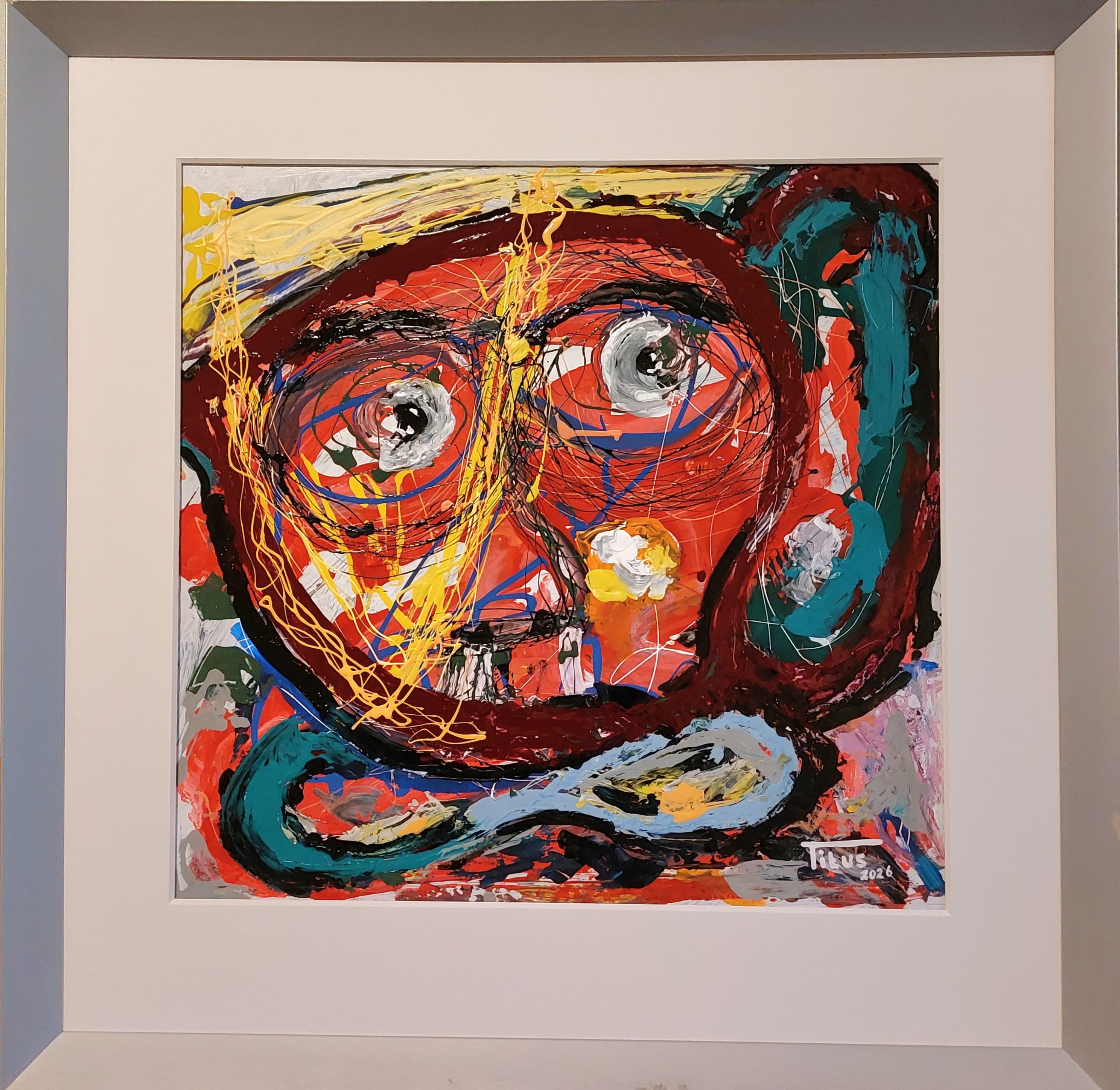 Dit is het eerste expressionistische schilderij in een reeks van 4 in de stijl van de CoBrA-beweging (Avant-garde 1948-1951). De focus ligt bij dit eerste deel op een gestileerd gezicht met grote, ronde ogen en één oor in expressieve lijnen. Het is een modern werk met gebruik van warme en diepe kleuren. Dikke verfklodders met een expressieve lading kenmerken dit schilderij. Titel: "Brains". Voorzien van passe-partout en zilvergrijze lijst met glas.