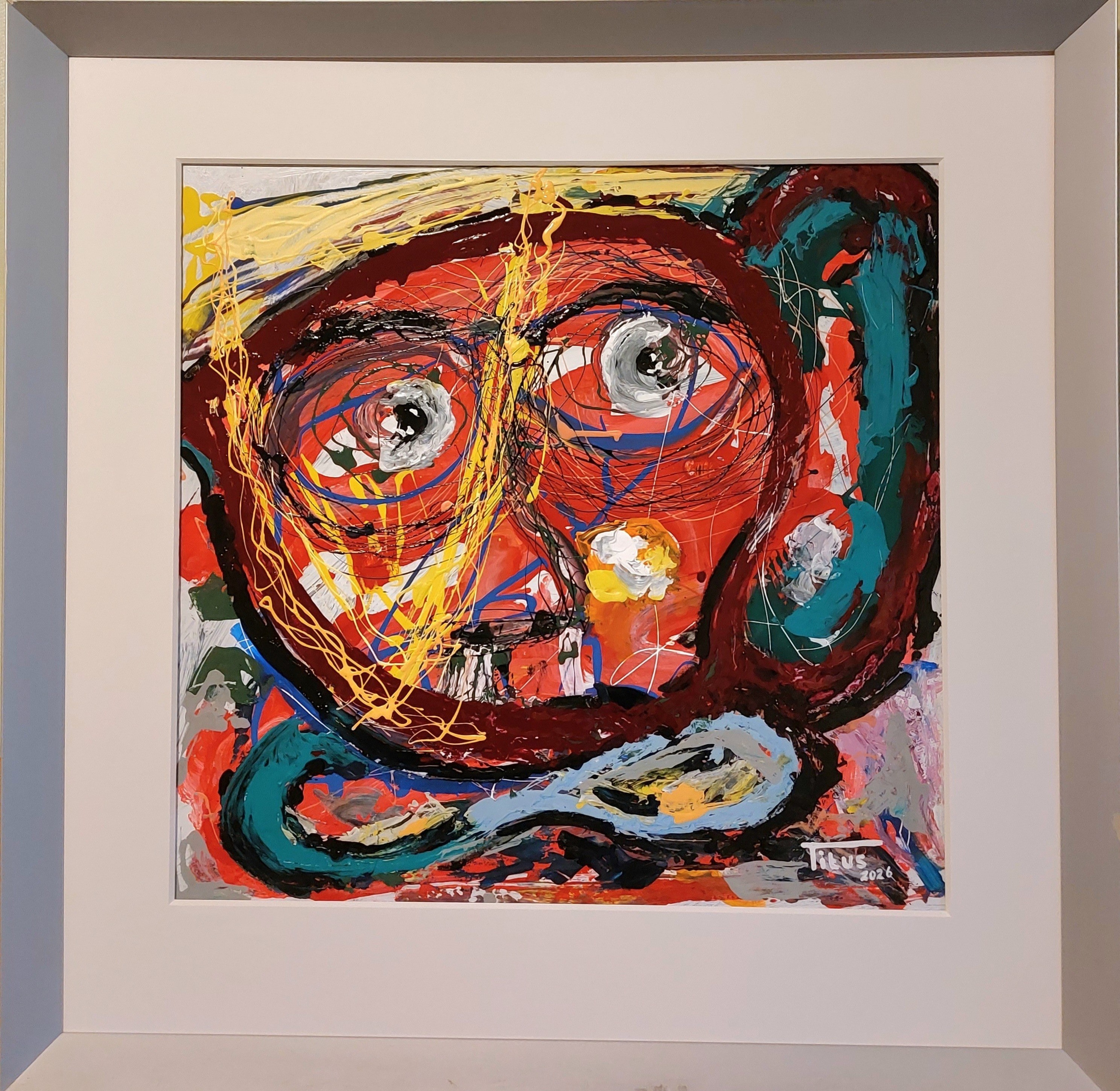 Dit is het eerste expressionistische schilderij in een reeks van (minimaal) 6 in de stijl van de CoBrA-beweging (Avant-garde 1948-1951). De focus ligt bij dit eerste deel op een gestileerd gezicht met grote, ronde ogen en één oor in expressieve lijnen. Het is een modern werk met gebruik van warme en diepe kleuren. Dikke verfklodders met een expressieve lading kenmerken dit schilderij. Titel: "Brains". Voorzien van passe-partout en zilvergrijze lijst met glas.