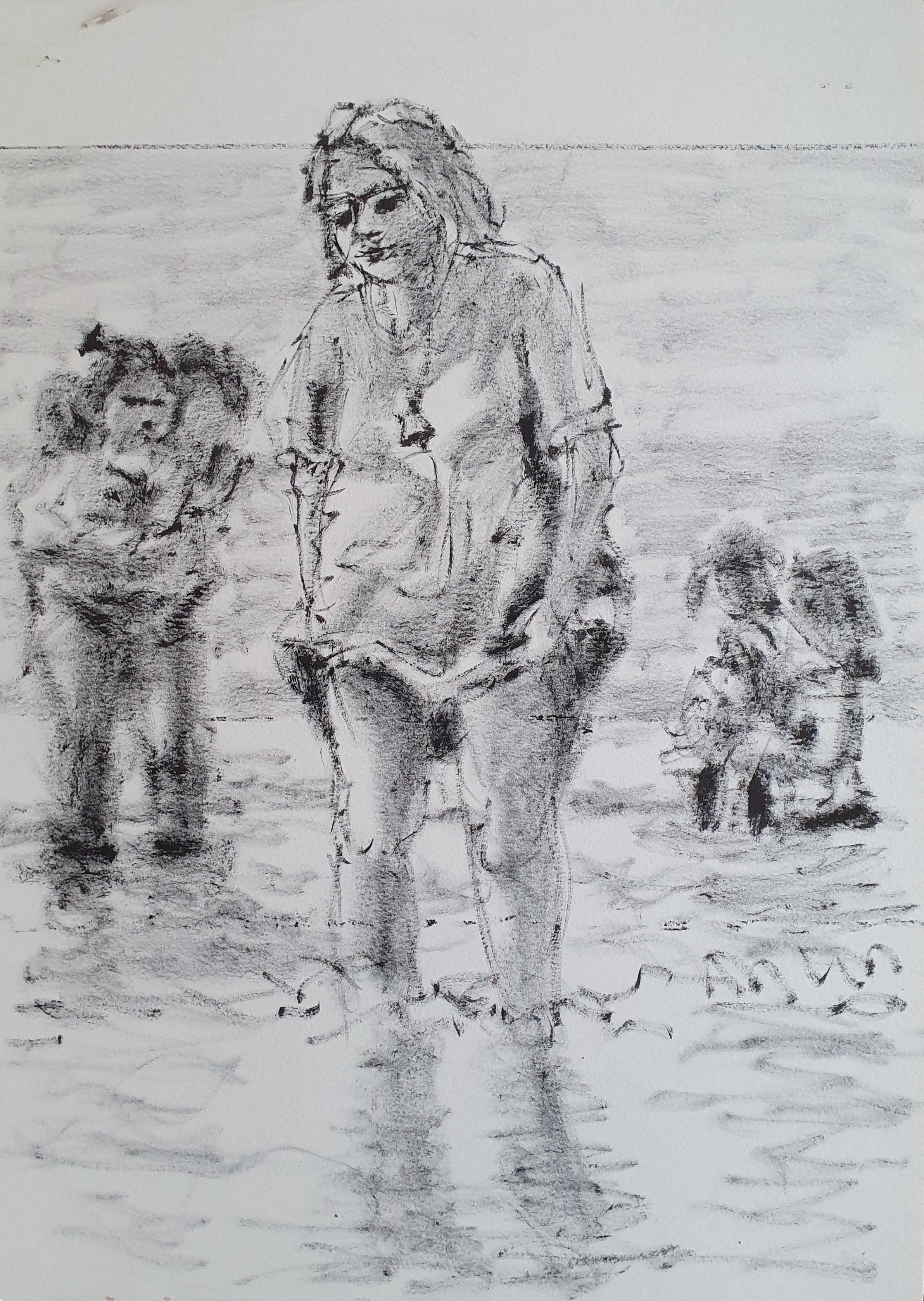 Studie van de familie aan het Hollandse strand met een bijna lege chinese brush stift.