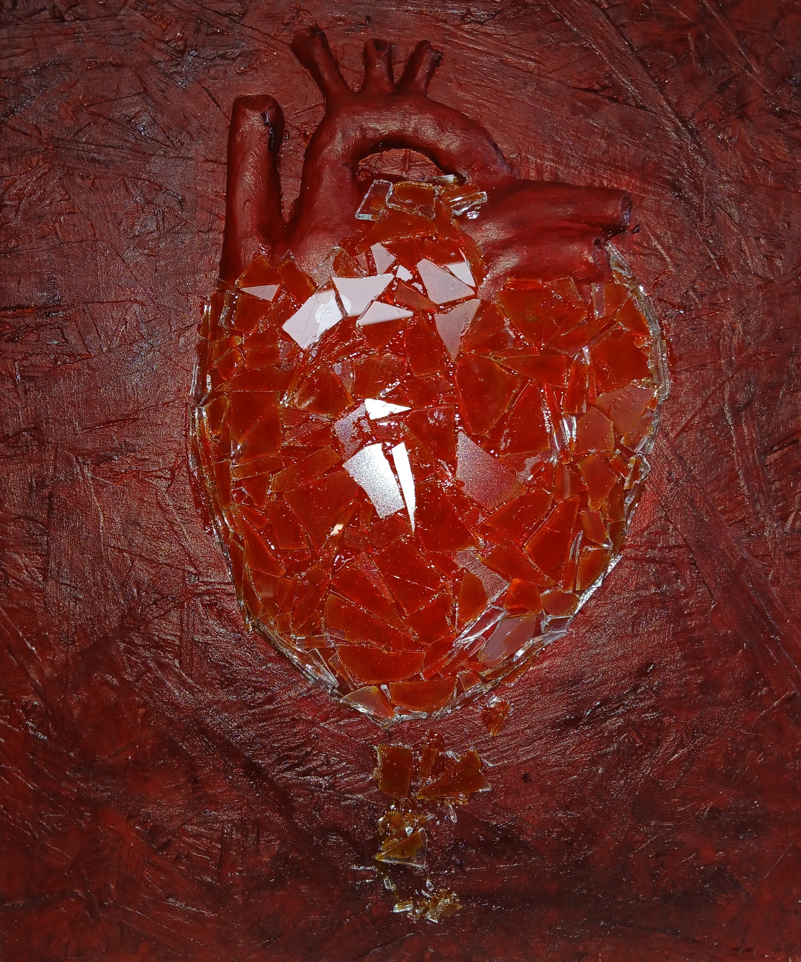 Mixed media (olieverf, glasscherven, klei en purschuim op OSB paneel)