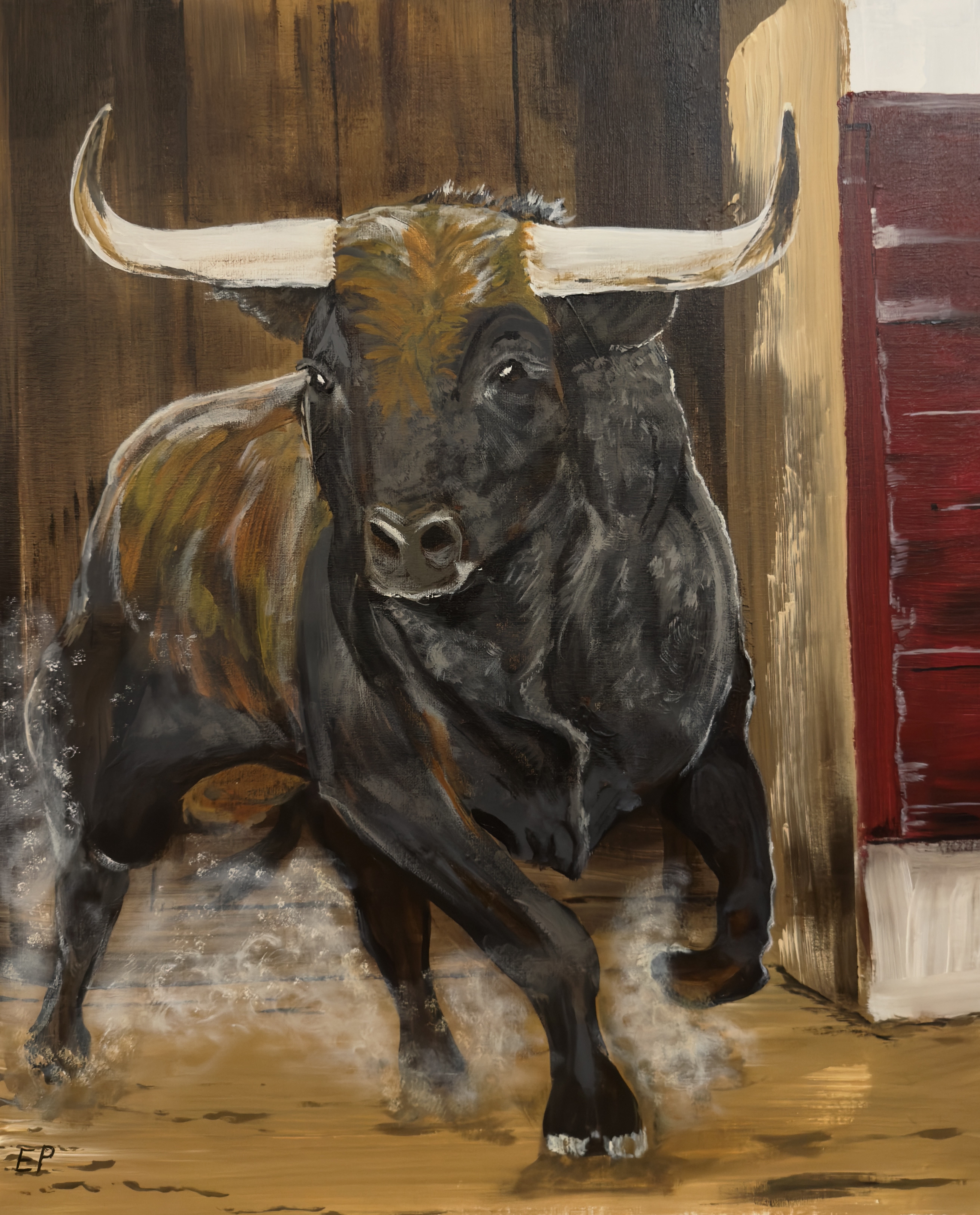Bull’s Eye vangt het moment waarop de stier met ongekende kracht naar voren stormt. Je ziet de spanning in zijn spieren, de focus in zijn ogen en het stof dat omhoog spat zodra hij de arena verlaat. Het werk zet je bijna oog in oog met het dier. De combinatie van warme houttinten en donkere, robuuste kleuren benadrukt zijn energie en maakt de scène intens en levensecht. Een dynamisch schilderij dat de pure kracht en impact van dit bijzondere moment voelbaar maakt.