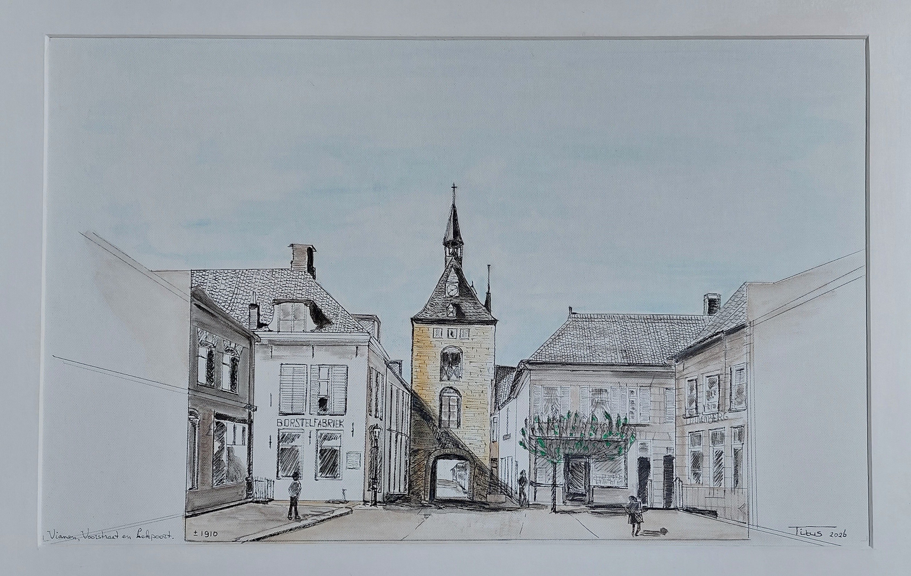 Oude tijden herleven met zicht op de iconische Lekpoort te Vianen anno 1910. U kijkt van zuid naar noord. Dit is de kruising van de Voorstraat met rechts de Langendijk en aan de linkerzijde de Kortendijk.