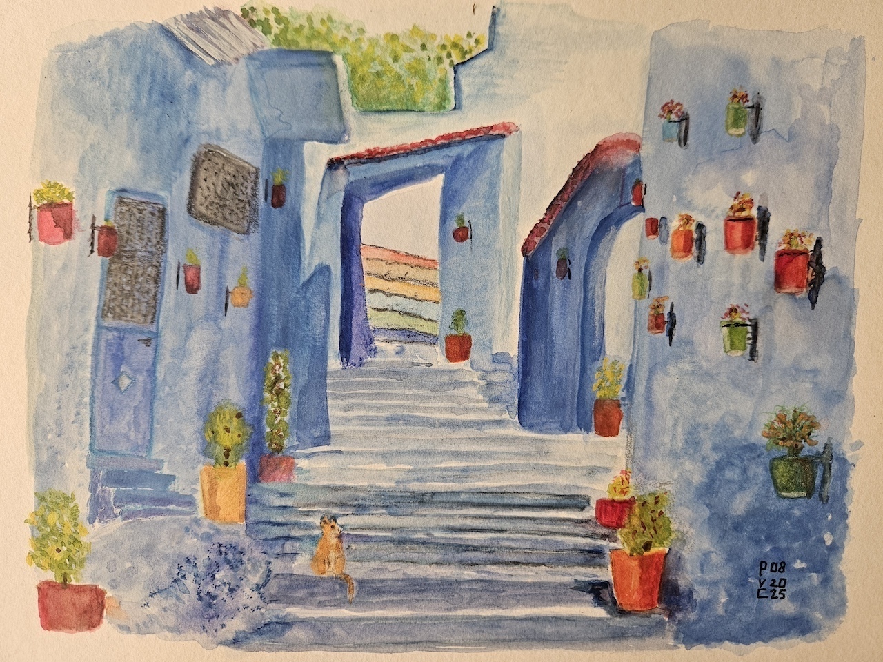 Voor mijn acrylwerk ben ik begonnen met een opzet in aquarel. Na het afmaken van het acryl schilderij ben ik er verder mee gegaan. Nu is het ook af. Chefchaouen is de blauwe stad van marokko met heel veel straten in het blauw. En met geschiedenis voor mijn schoondochter en mijn zoon.
