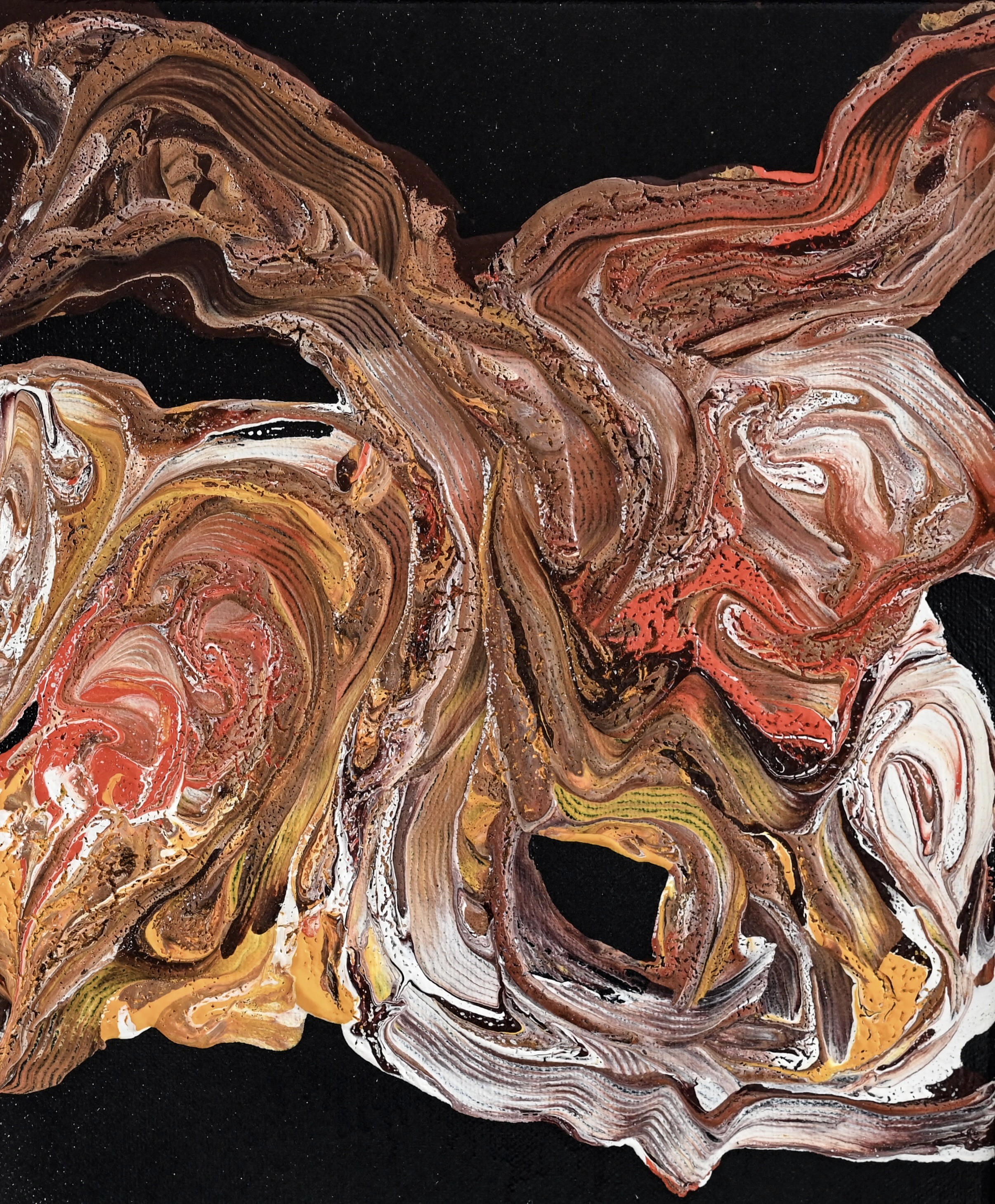 Eerst heb ik verschillende (verdunde) kleuren opgebracht en vermengd met een 'depper'. Vervolgens met een geribbeld paletmes naar vormen gezocht. Tenslotte het geheel met 'siliconen olie' geinjecteerd om een chemische reactie te stimuleren. Het resultaat is zeer verrassend. Een zwarte effen baklijst is bij de prijs inbegrepen.