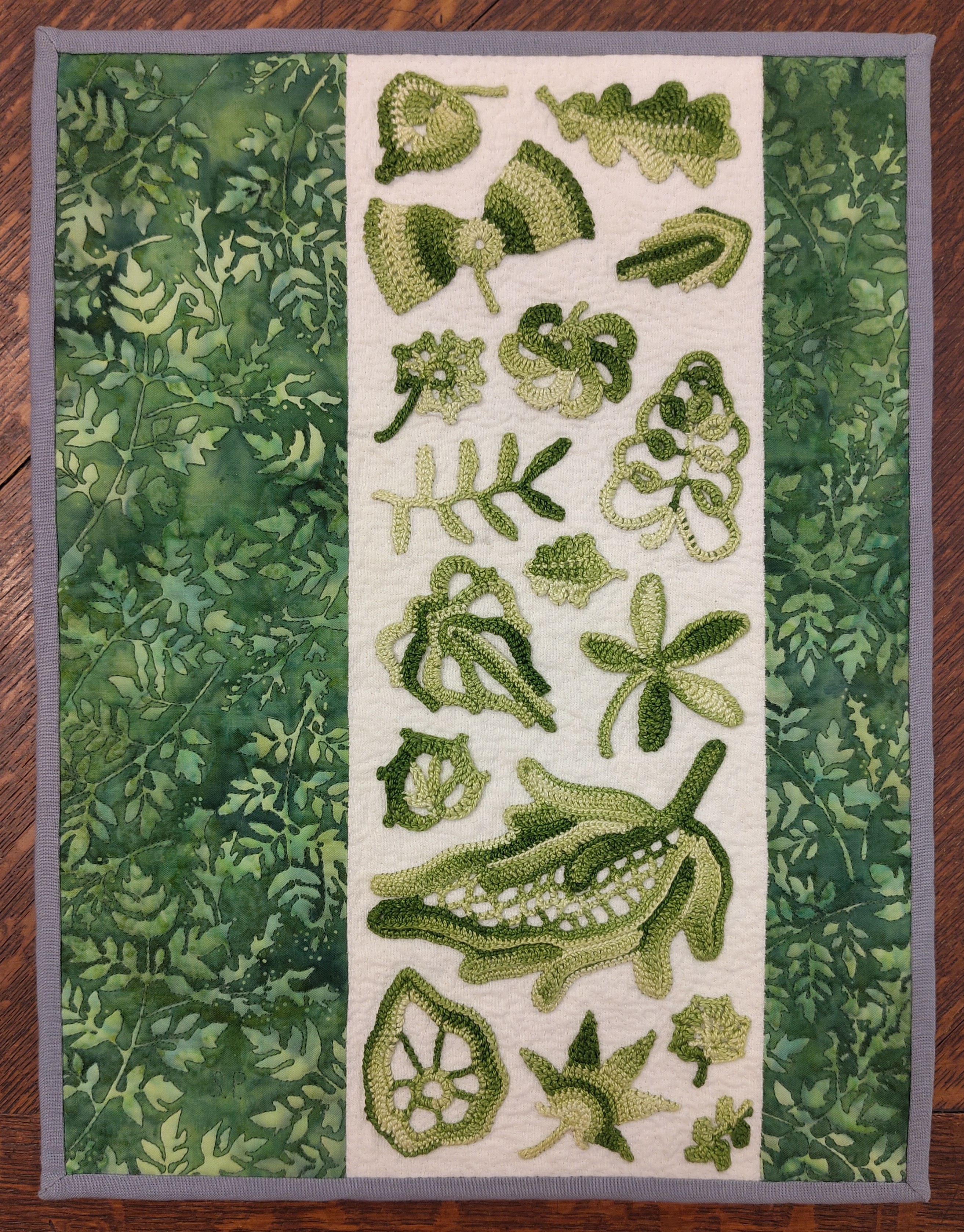 Een wandkleed met heel veel groen. Vorige zomer ben ik met de trein naar Slovenië geweest. Onderdeel van deze reis was een stoptrein dwars door de bergen van Oostenrijk, een 4 uur durende route met contstant prachtige uitzichten op torenhoge muren van groen. Een prachtige rit, maar ook heel overweldigend. Toen ik thuis kwam moest ik deze ervaring verwerken, zo is dit werk geboren. Gehaakte bladeren geappliqueerd op een witte baan tussen twee gequilte velden van groen.