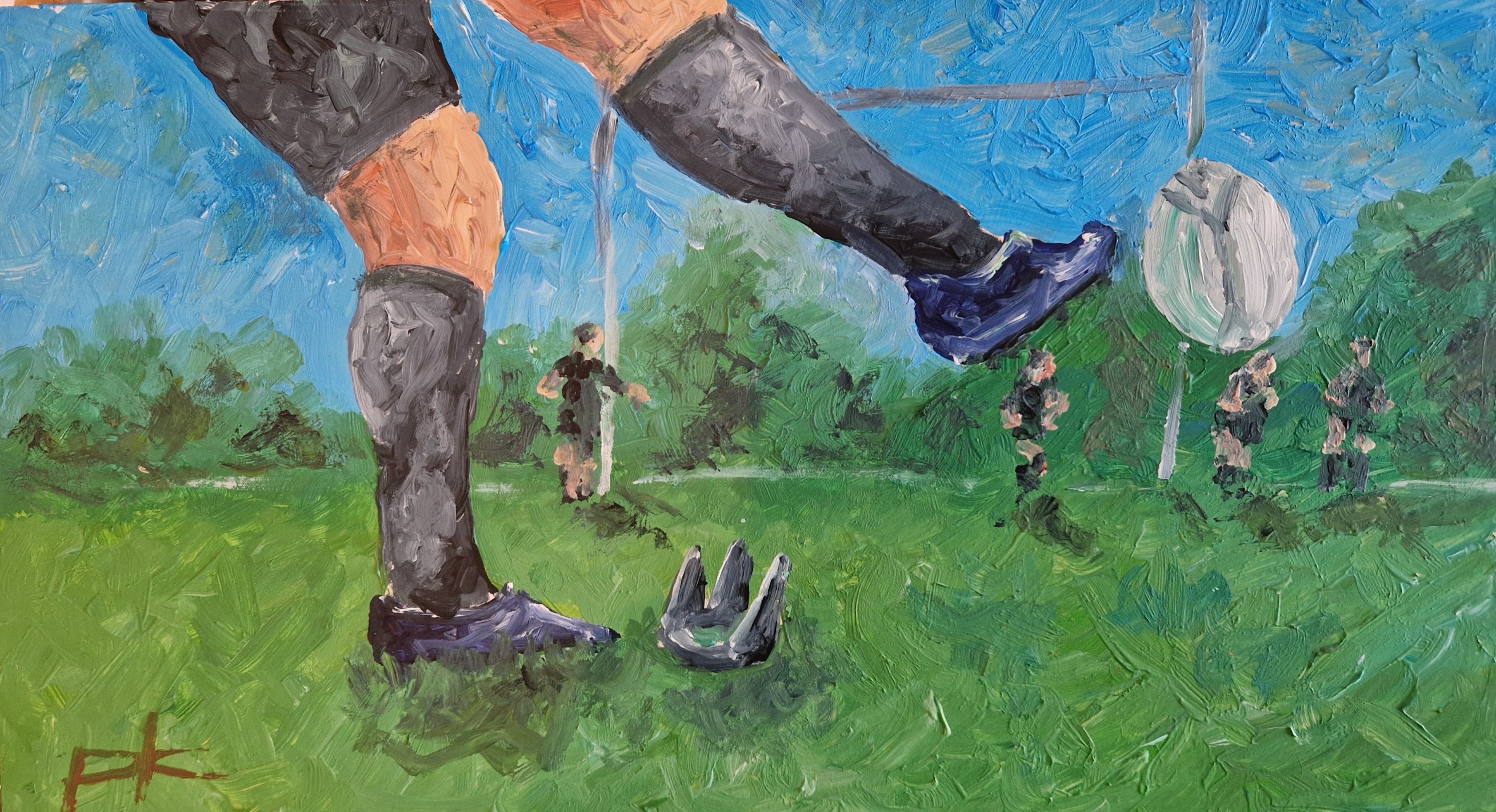 Met Conversion wil ik het beslissende moment van spanning en precisie in het rugby vastleggen. Dit schilderij toont de cruciale seconde na een try, wanneer de speler zich concentreert om de bal tussen de palen te schieten voor die kostbare twee extra punten. Het perspectief is bewust gekozen: de kijker staat als het ware op het veld, en voelt de druk en intensiteit van het moment. De losse, krachtige penseelstreken en het levendige kleurgebruik benadrukken de dynamiek en energie van het spel. De groene grasmat, de heldere lucht, en de schaduwen van de spelers op de achtergrond versterken het gevoel van beweging en focus. Dit werk is niet alleen een weergave van een sportief moment, maar ook een ode aan de vastberadenheid, teamgeest en precisie die rugby zo bijzonder maken. Het is een herkenbaar beeld voor iedereen die ooit de spanning van een wedstrijd heeft ervaren: dat ene moment waarop alles stil lijkt te staan, en alles afhangt van die ene kick.