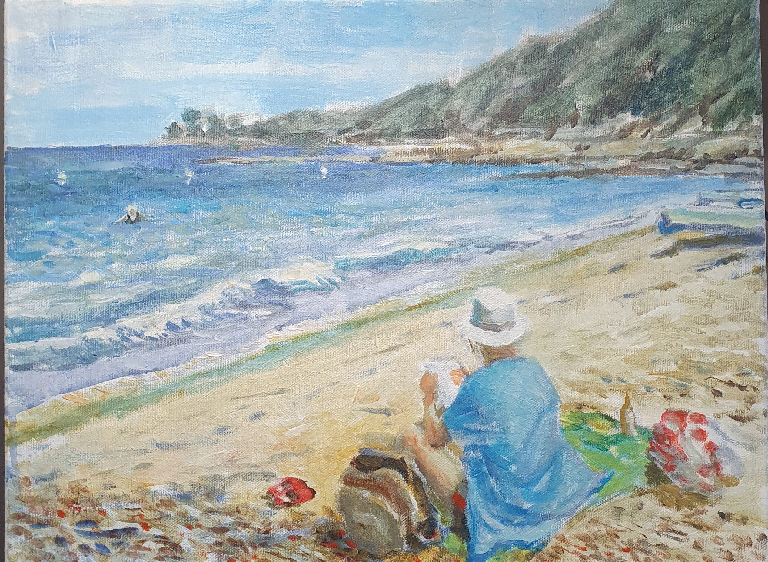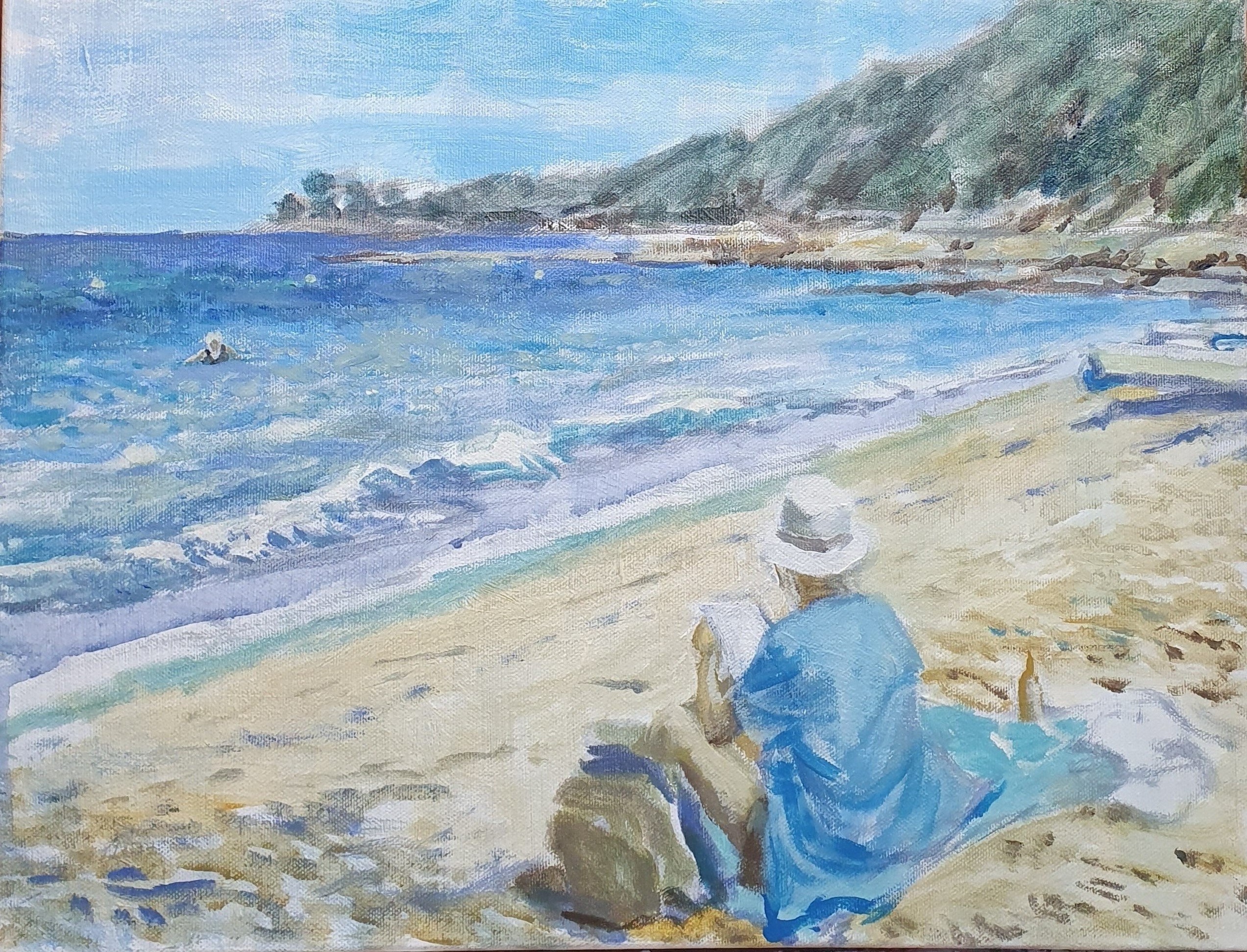 Zittend figuur aan het strand met zicht op een groene heuvel.