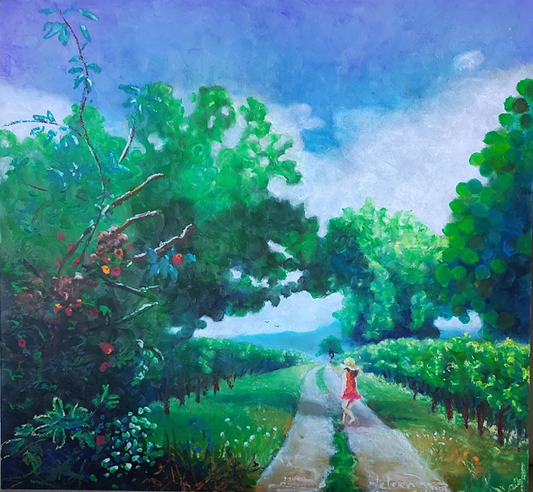 Dit werk is gemaakt met oilsticks (olieverf met bijenwas) op hout en heeft de afmeting van 49x52 (er zit een bijpassende baklijst omheen). Met oilsticks werken vind ik heerlijk, ik werk met het 'krijt zelf, en met mijn handen. Ik meng op het hout of doek zelf. Het voordeel van Oilsticks is dat het net als olieverf fijn langere tijd vermengbaar is, maar toch uiteindelijk geheel opdroogt zodat het eventueel een vernis laagje kan hebben. Het werk met Oilstics heeft een bijzondere glans, en de richtingen, afdrukken en vegen blijven zichtbaar wat een geheel andere beleving geeft als bijv. acrylverf.