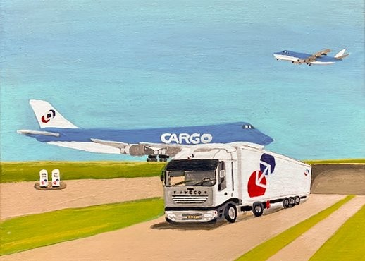 Schilderij gemaakt voor de CTS Group in Nieuw Vennep. Dit schilderij geeft de activiteiten van dit transportbedrijf rond Schiphol aan. Locatie Hoofdvaart, Hoofddorp