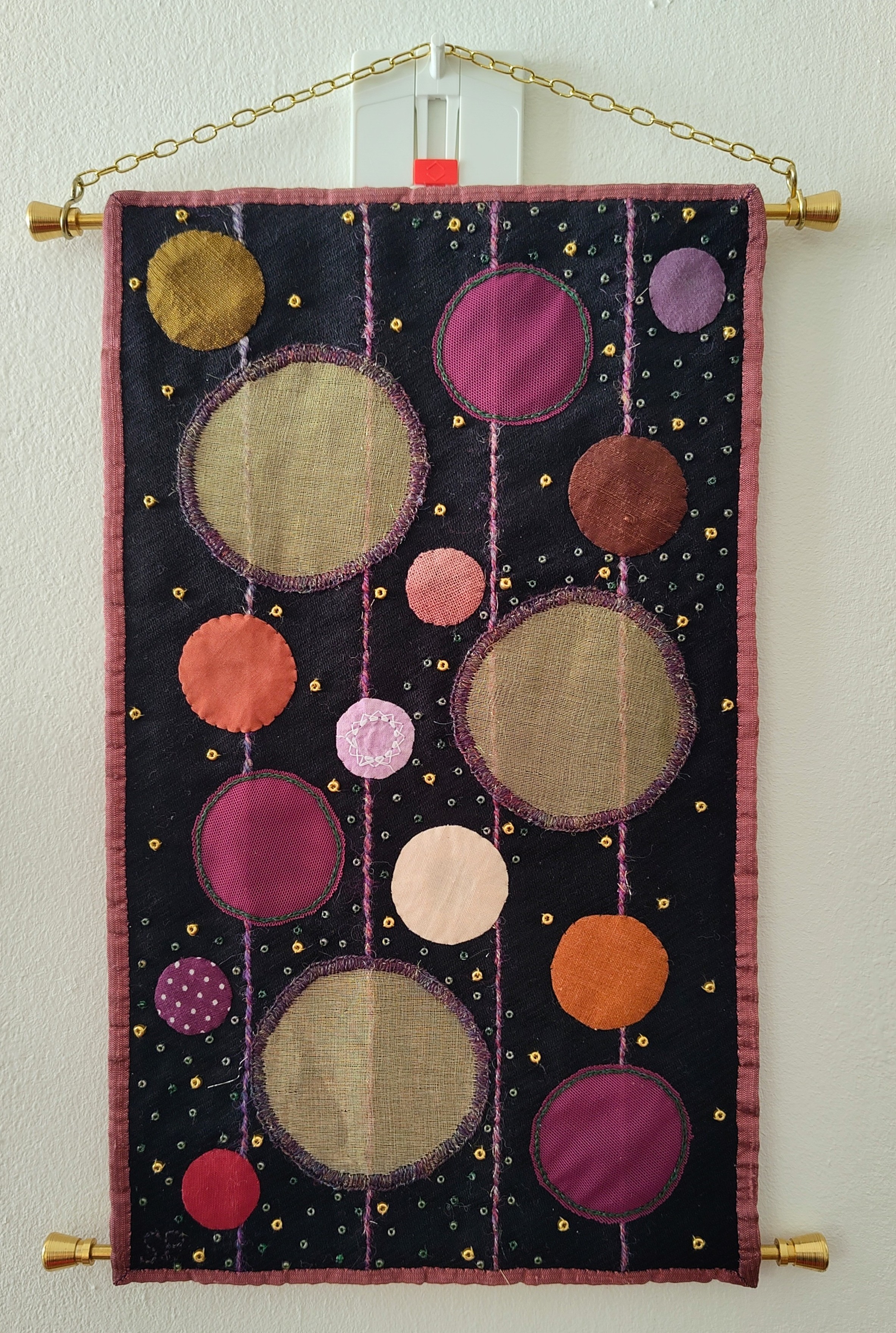Deel 2 van mijn serie 'Just Playing'. Deze serie gaat over de intuitive manieren waarop kinderen wereldwijd spelen. Dit werk, een wandkleed, is een verbeelding van hoe, in het spelen, kinderen soms van wereld naar wereld lijken te dansen, van avontuur naar avontuur springen, en zo hele universa creëren en ontdekken. Kralen en applique in zijde, katoen en metaalzijde op wollen stof