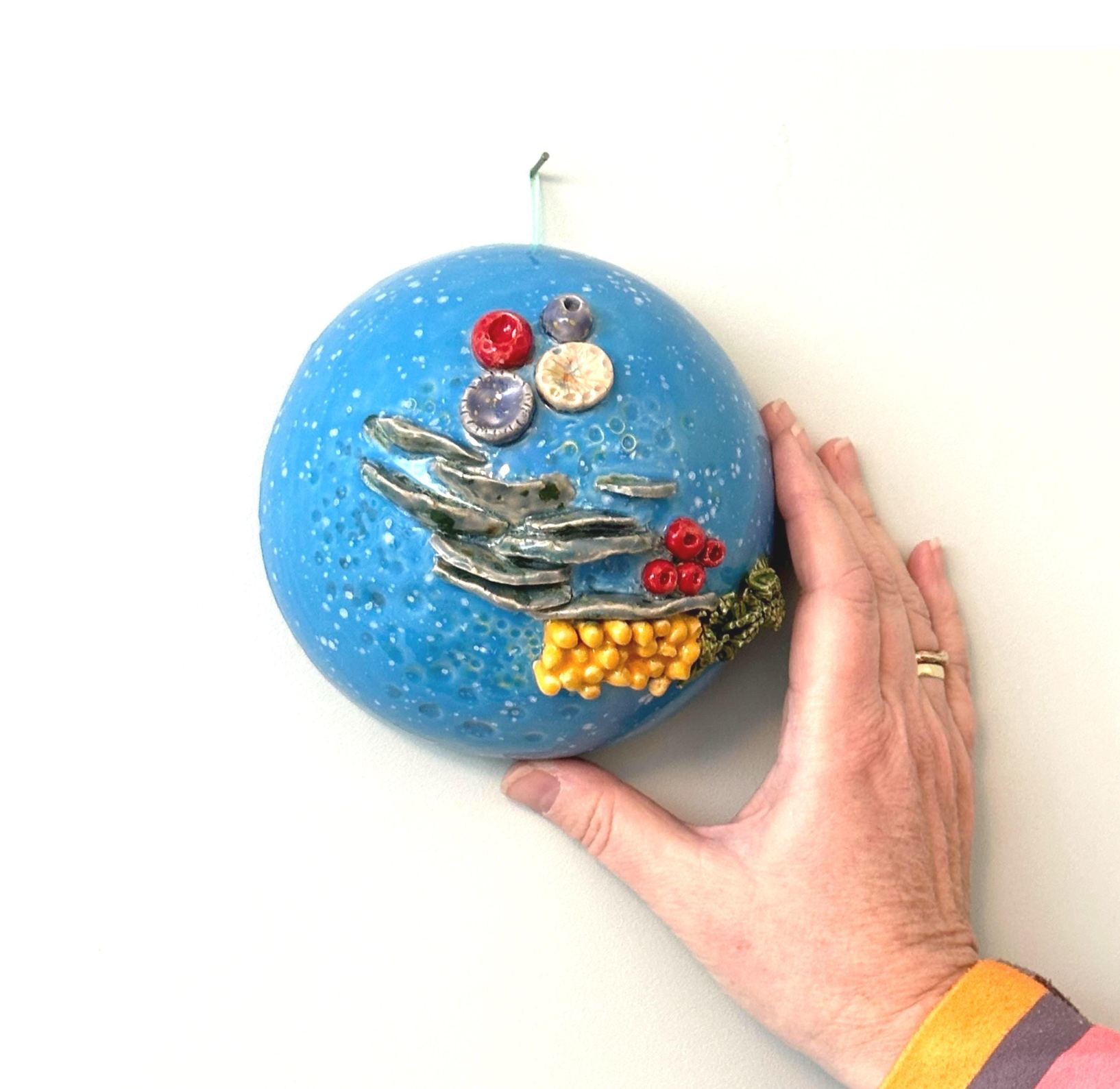 Een oceaan gevangen in keramiek – in deze halve bol lijkt het leven onder water zachtjes te bewegen. De diepblauwe glazuurlaag vormt de achtergrond voor een koraalrif vol kleur en ritme. Gelaagde vormen in grijsgroen golven als zeeplaten over de bol, terwijl rode en gele koralen als kleine dansers hun plek innemen tussen het glinsterende blauw.