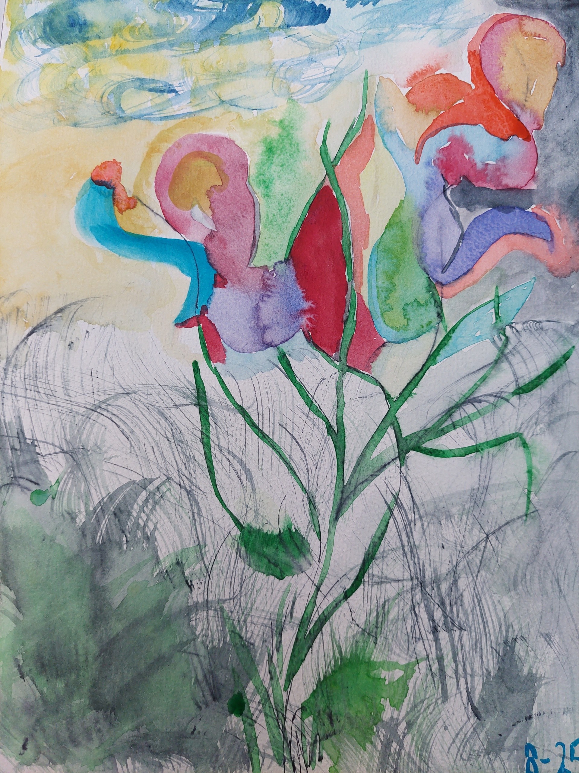 Aquarel, vanuit abstracte vormgeving zit er ets van figuratie in.Lichte delen zijn eerst uitgespaard daarna met pen op natte ondergrond.