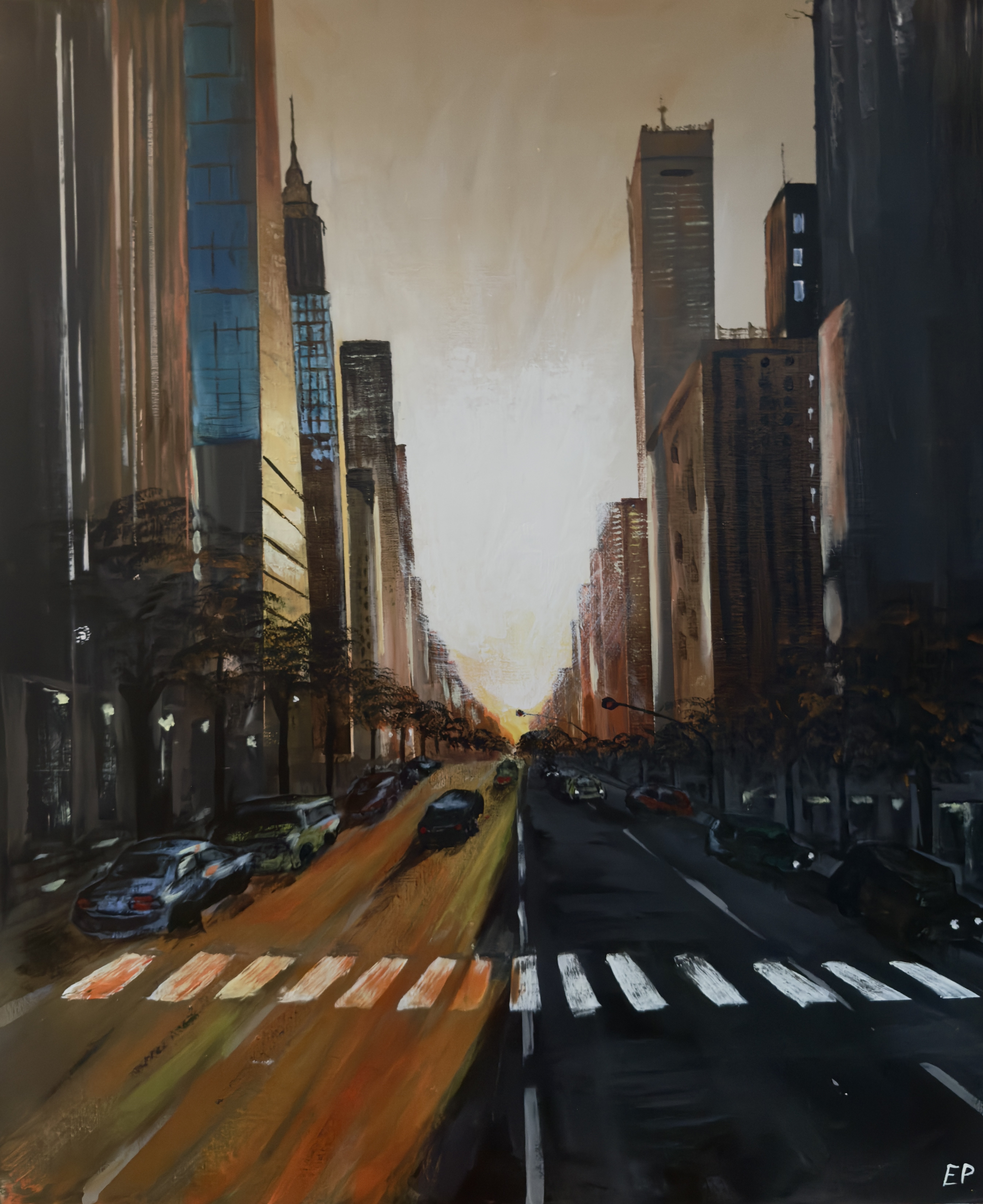 Geschilderd door Erik Pieke Dit werk laat het einde van een dag zien. Niet abrupt, maar verstild. Het moment waarop het licht zakt, de stad tot rust komt en alles even mag landen. Het schilderij is opgebouwd vanuit sfeer en licht, waarbij het verdwijnpunt en de warme gloed richting de horizon de kijker vanzelf het beeld in trekken.
