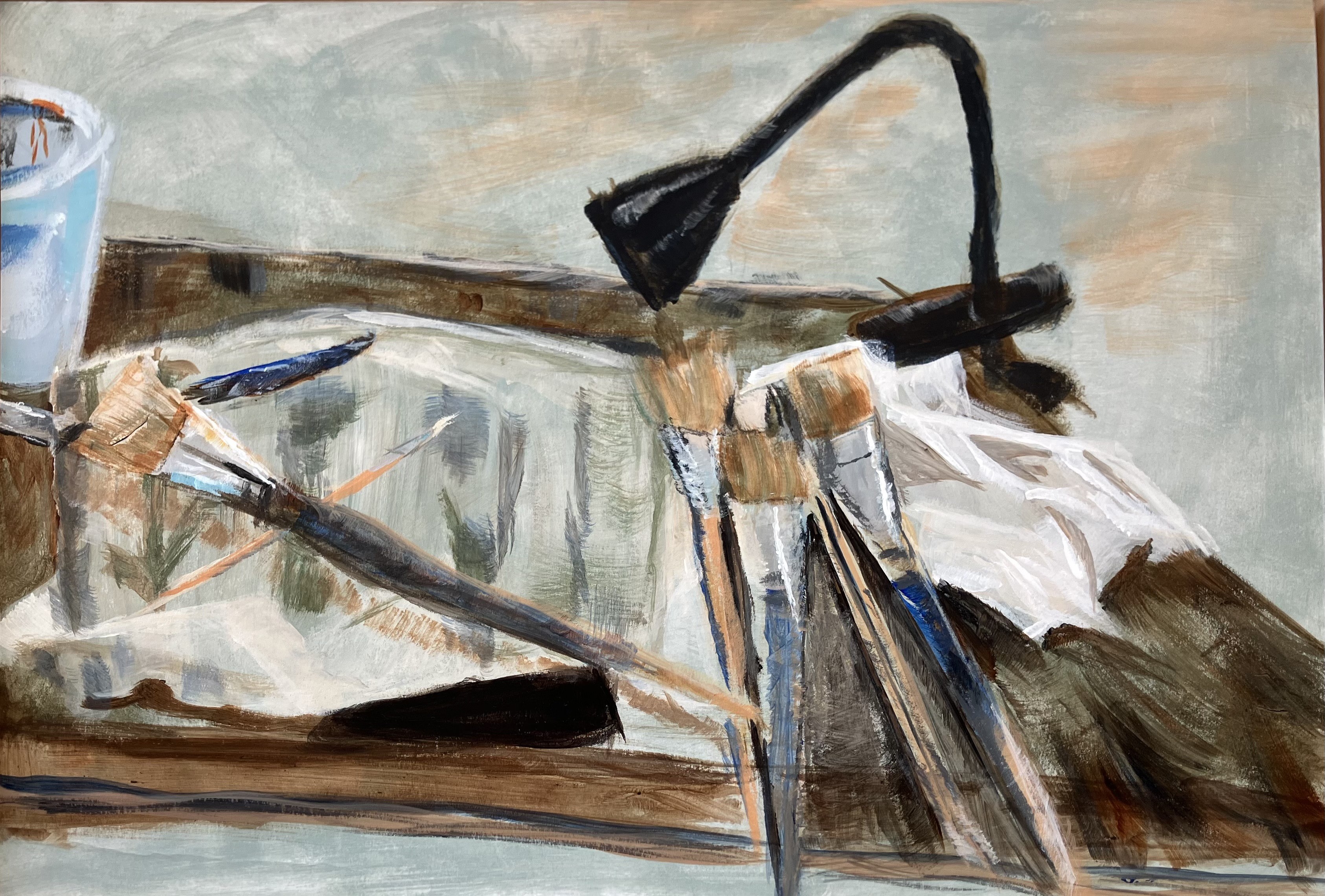 In mijn atelier begint een schilderij niet met een beeld, maar met een handeling. Met het oppakken van een penseel, het zoeken naar richting, het onderzoeken van licht. In dit werk staat niet het uiteindelijke schilderij centraal, maar de plek waar het ontstaat. Penselen liggen nog met sporen van verf op de werktafel, verlicht door het atelierlicht wat warm en zacht is en wat een intieme sfeer creëert. Mijn atelier is een plek van zoeken en beweging. Hier begint elk schilderij met een eerste toets.