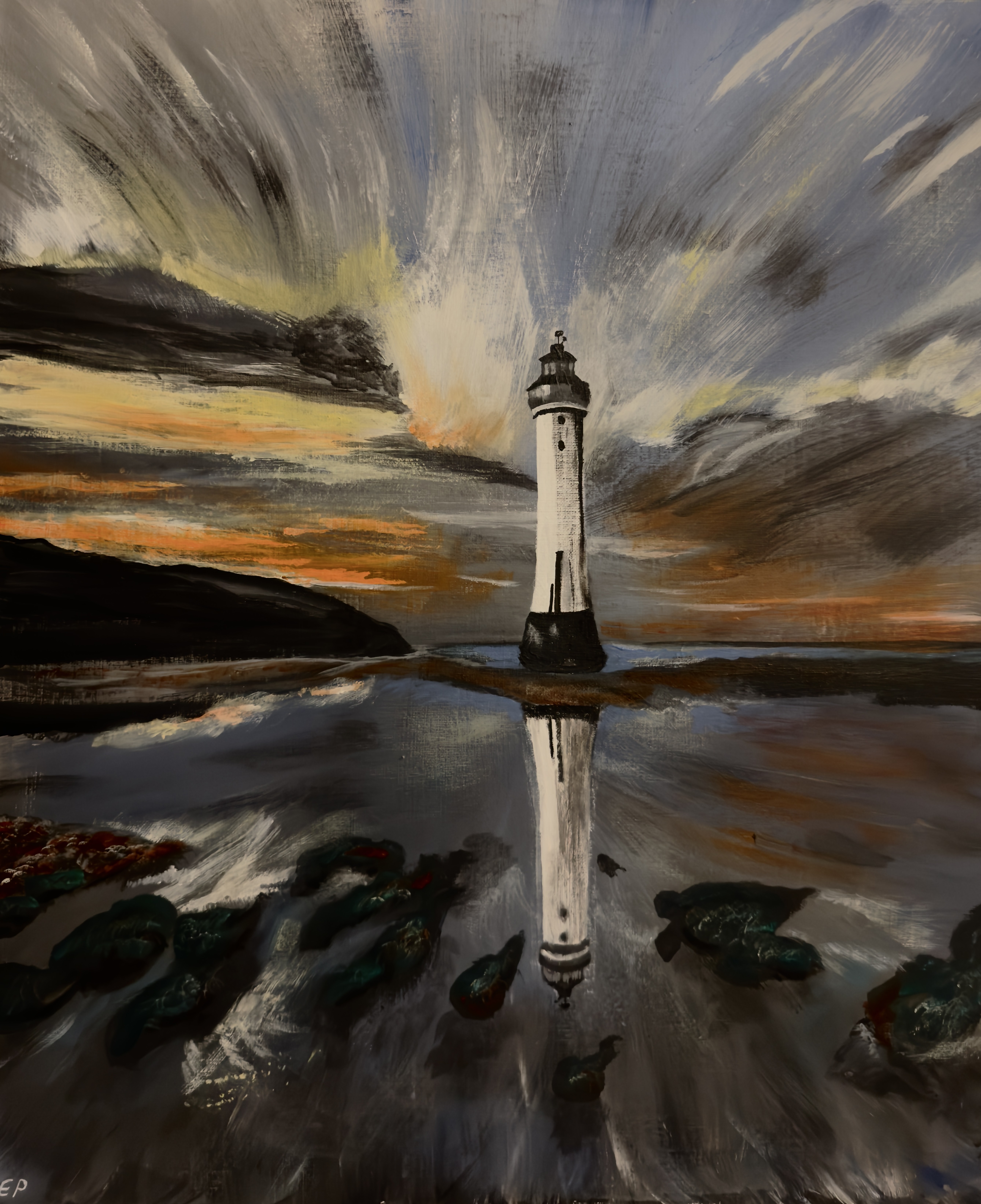 Dit schilderij draait niet om het object, maar om de ruimte eromheen. De blik wordt meegenomen richting de einder, waar lucht, licht en diepte samenvallen. Een werk over afstand en verstilling, waarin de horizon niet begrenst maar opent. Geschilderd door Erik