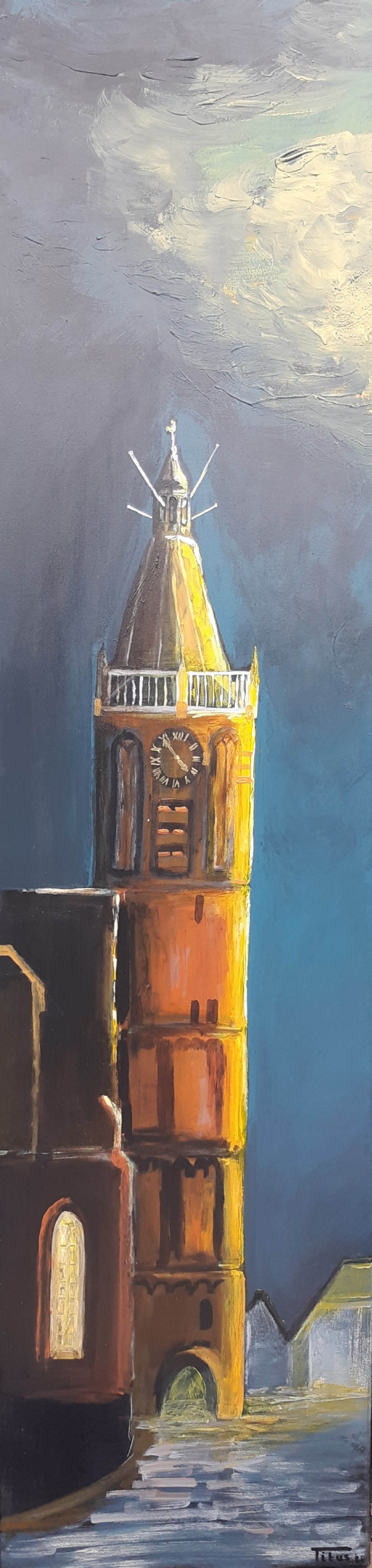 Na een onweer bij westenwind en een ondergaande zon. In de kerk brandt licht en schijnt door een raam.