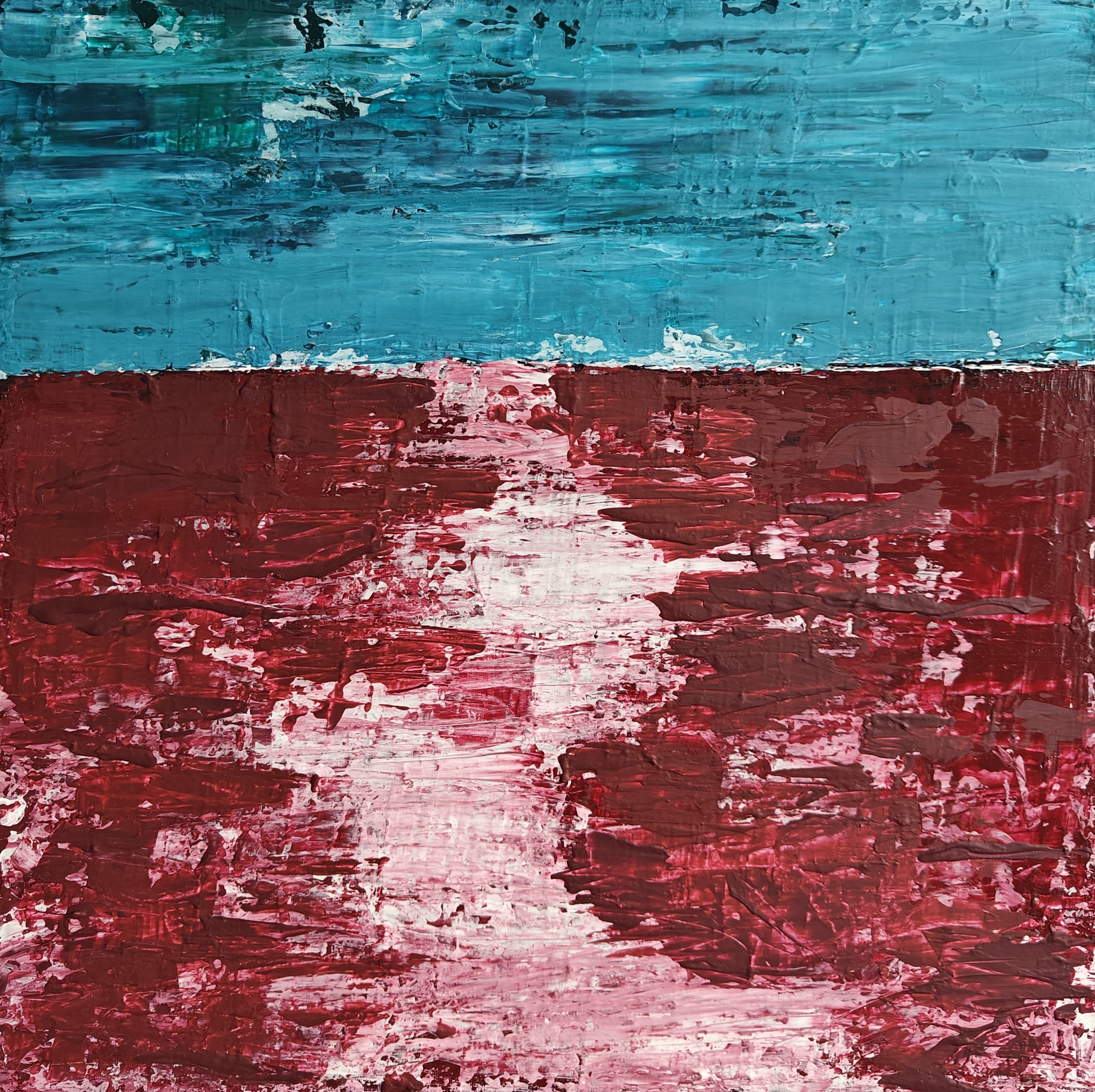Water. Stromend door de horizon. Rood. Is het bloed? Is het een illusie van een schipper? Een landschap van verkenning en verbreding. De lucht afgebeeld alsof de dag in één moment is gevangen. Het beeld dat doet inspireren en doet kalmeren. Is de lucht nou water of het water de lucht?