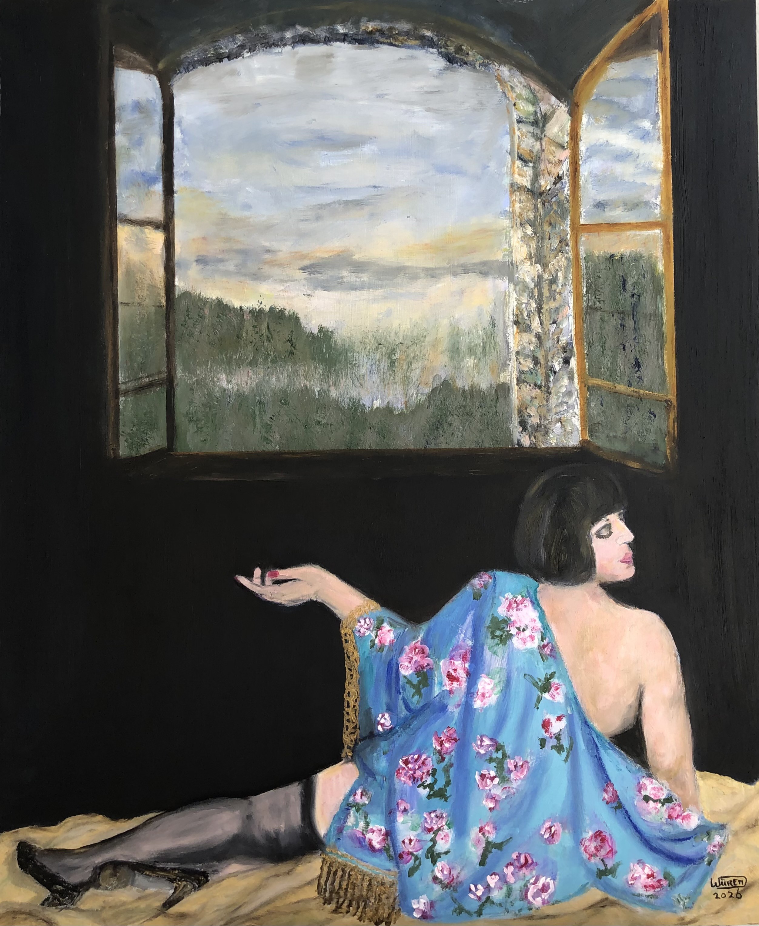 De meest intieme kamer in het huis. De plek om tot rust te komen, om te slapen. Maar ook een plek om onbespied te kunnen dromen. Waar denkt de vrouw aan. Haar houding is zelfbewust, misschien gespeeld? Oefent ze haar rol voor in het echte leven? Door het openstaande raam verdwijnen haar verborgen gedachten om pas weer terug te keren wanneer ze er klaar voor is.