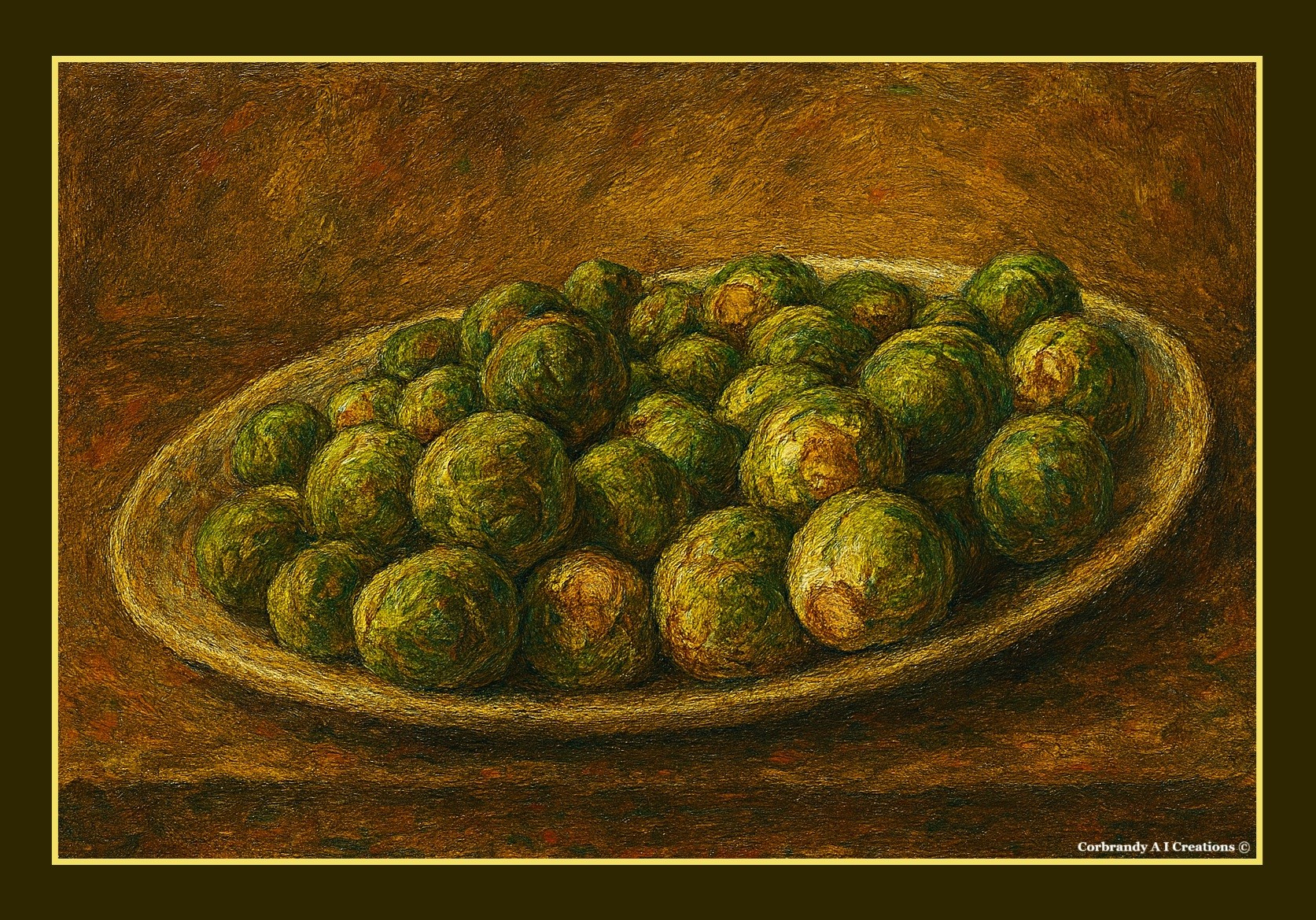De spruit, vaak vergeten in de grandeur van de keuken, ligt hier als een echo van eenvoud. Groen, rond, gesloten-maar in haar kern: een belofte van groei. De penseelstreken fluisteren, alsof van Dorsser zelf de groente heeft aangeraakt met het geduld van een herfstmiddag.