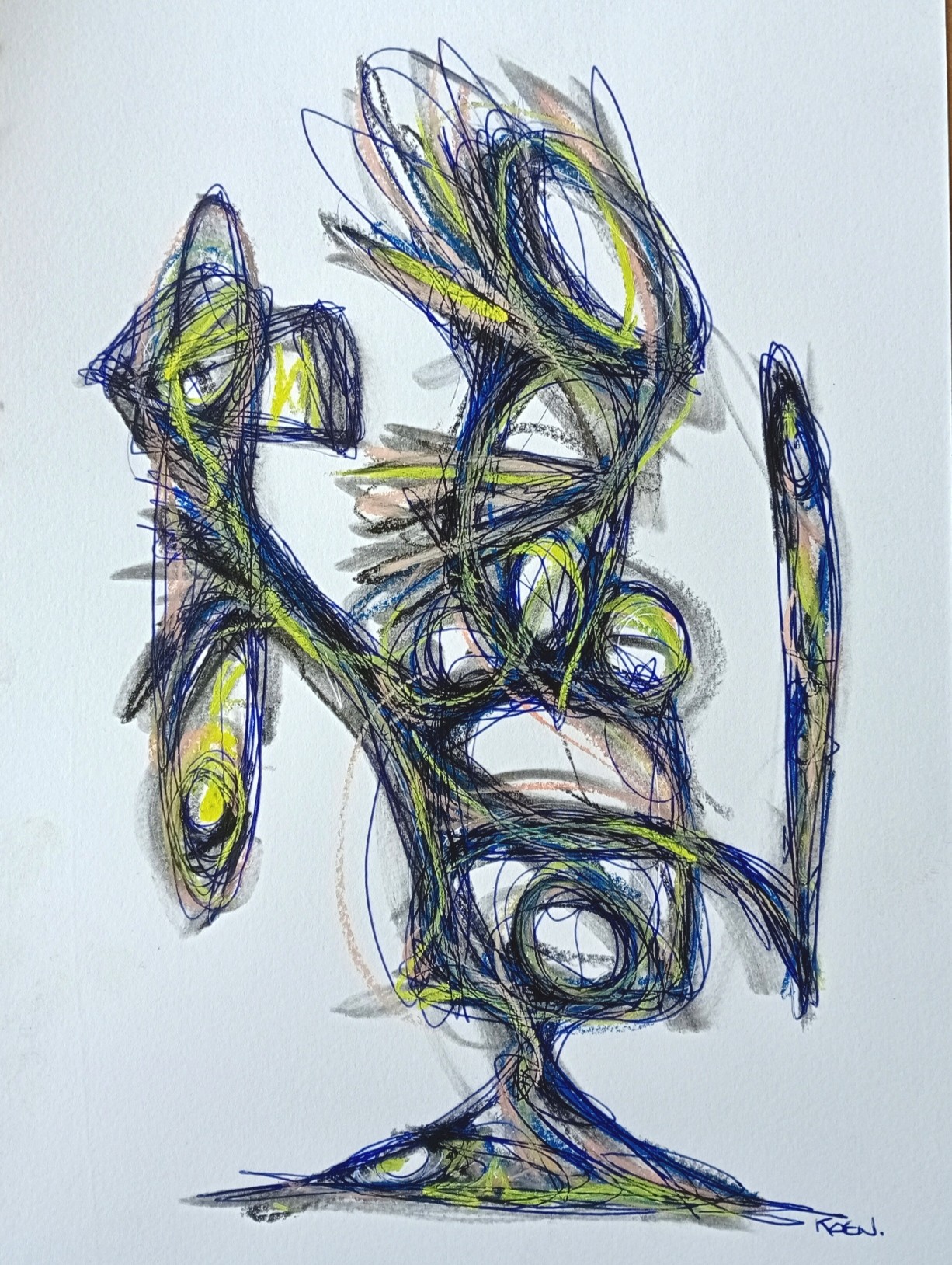Tekening met pastelkrijt, acrylstift en fineliner