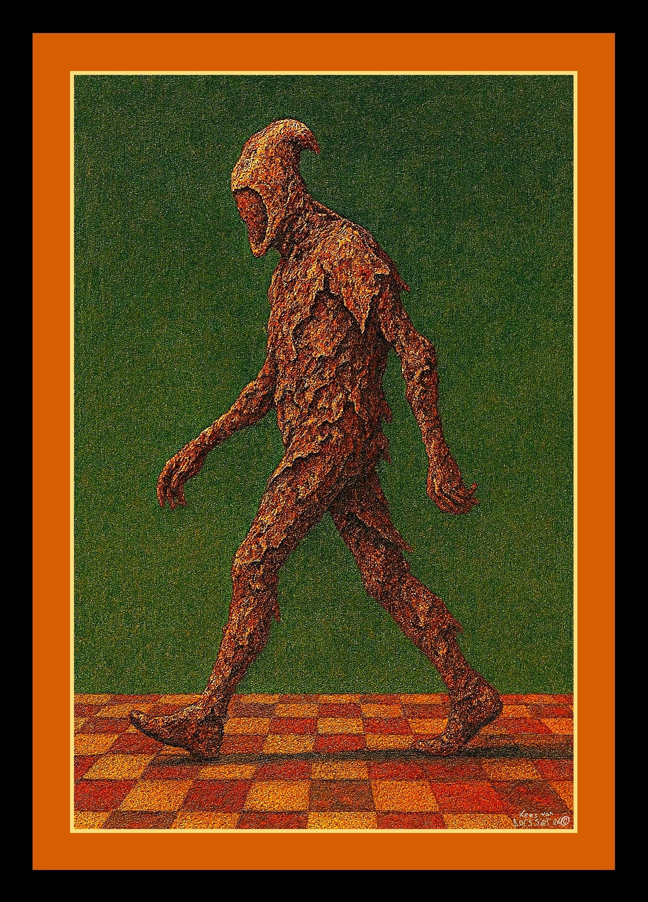 Hij loopt, niet als mens, maar als echo van onze keuzes. Zijn huid is geen vlees, maar roest, gesmeed uit lithium, kobalt, en vergeten rivieren. Hij draagt geen gezicht, want hij is ieder van ons-de klik, de aankoop, de groene leugen die wij geloven. Onder zijn voeten, een vloer van patronen, zoals wij patronen volgen zonder te vragen waar ze beginnen. Hij wandelt voort, door de tijd, door de illusie van duurzaamheid, door de schaduw van onze hoop. En wie hem ziet, ziet niet een monster, maar een spiegel van wat wij liever niet erkennen. (wat wij voort brengen, wandelt ons voorbij).