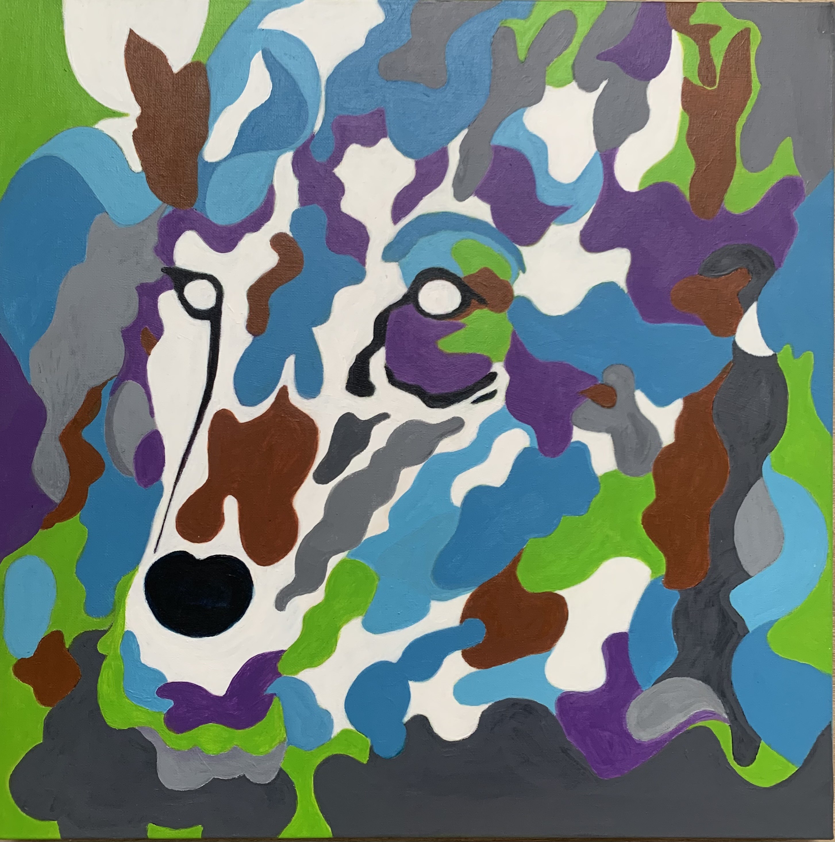 Ooit heb ik een muurschildering in Spanje gezien van een wolf. Geinspireerd hierdoor besloot ik een eigen abstracte versie te maken van dit veelbesproken dier. De vormen in kleur leiden tot nieuwsgierigheid. Ziet u ook de andere dieren die zijn verstopt?