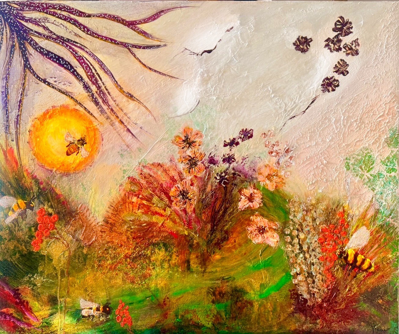 Project opgestart tijdens het Kunstenaarsfestival in Odoornerveen afgelopen 17 augustus. Mixed media met acryl, inkt en wax en structuren van woldraden en marmerpoeder. Nu afgemaakt.