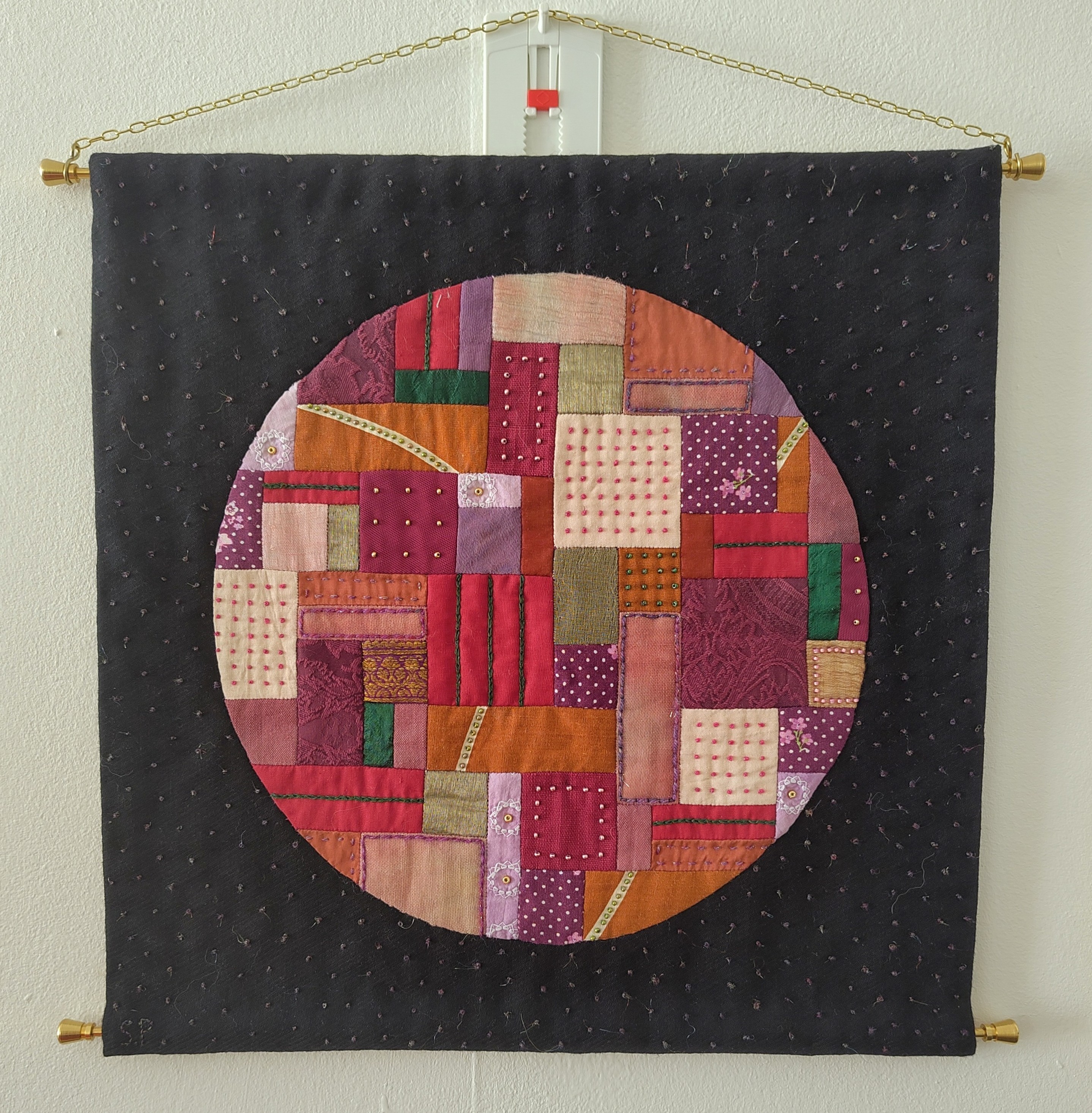 Deel 5 van mijn serie 'Just Playing'. Deze serie gaat over de intuitive manieren waarop kinderen wereldwijd spelen. Dit laatste werk uit deze serie is eigenlijk de conclusie, het doel van spelen: de wereld ontdekken. Door te spelen leren kinderen zoveel over hoe de wereld werkt en wat er allemaal te zien is. Ze leren zich te verwonderen over kleine details, ze leren met anderne om te gaan en te vertrouwen op hun eigen ideeën. Dit werk, en deze hele serie, herinnert mij er aan dat ik, ook als volwassene, tijd mag vrijmaken om te spelen, om op spontane manier te ontdekken en te leren. Borduurwerk en kraaltjes op patchwork van wollen, katoenen en zijde stof.
