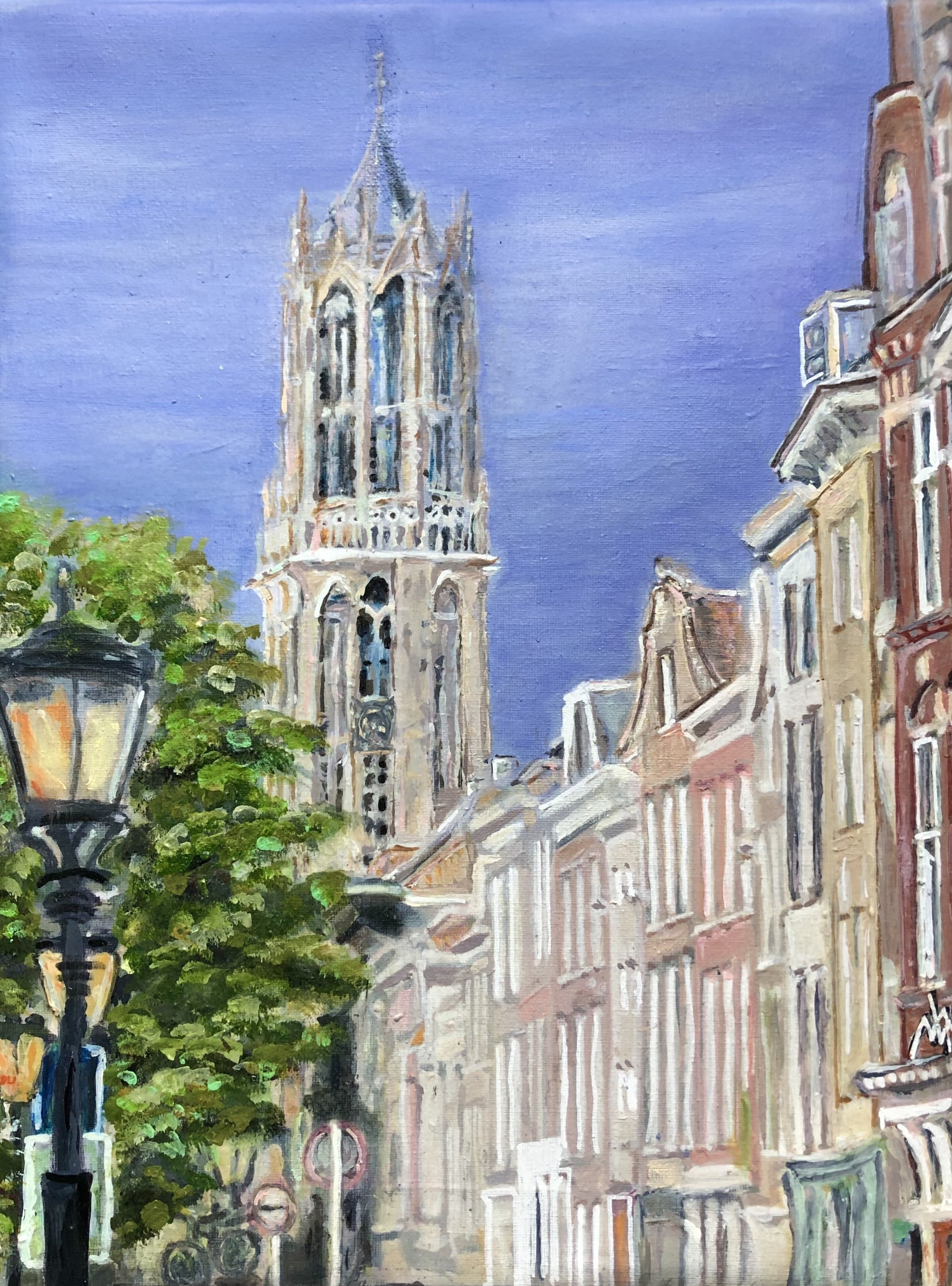 De Domtoren blijft voor mij een inspiratiebron vanwege zijn indrukwekkende uitstraling. In dit schilderij heb ik geprobeerd de sfeer van een heldere, zonnige dag vast te leggen, vlak voordat de lucht betrok voor een onweersbui. Het beeld toont hoe de karakteristieke gevelpandjes langs de Oudegracht harmonieus worden aangevuld en versterkt door de historische architectuur van de Domtoren. De toren straalt niet alleen kracht en statigheid uit, maar ook verfijning en een gevoel van verbondenheid, alsof hij het verleden, het heden en de toekomst van Utrecht met elkaar verbindt. Ik heb geprobeerd een warm en uitnodigend beeld te schilderen dat het hart en de ziel van Utrecht weerspiegelt.